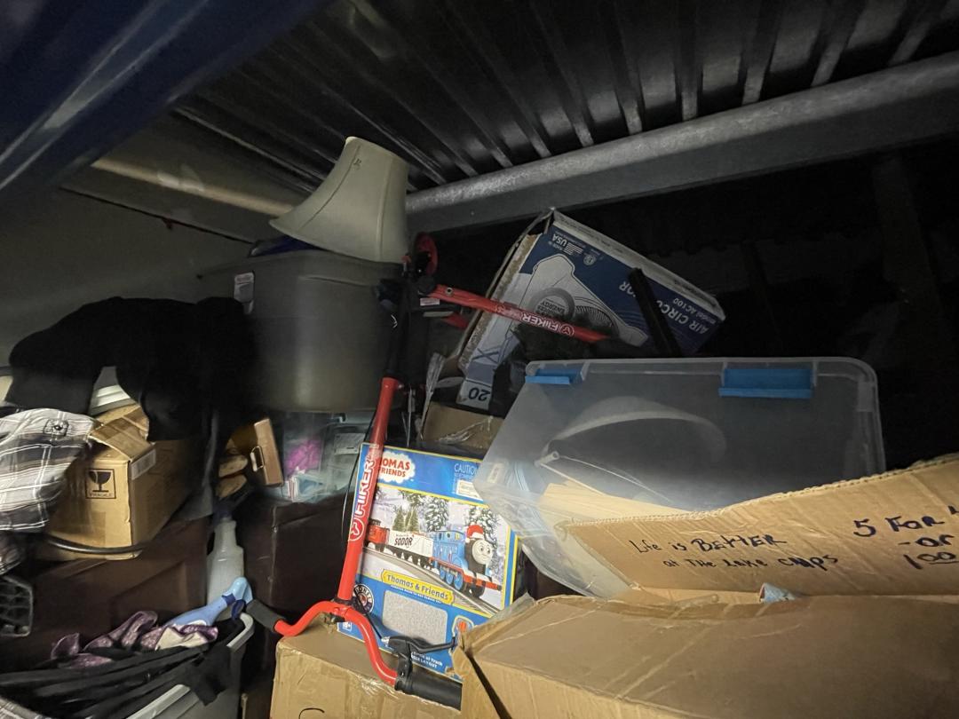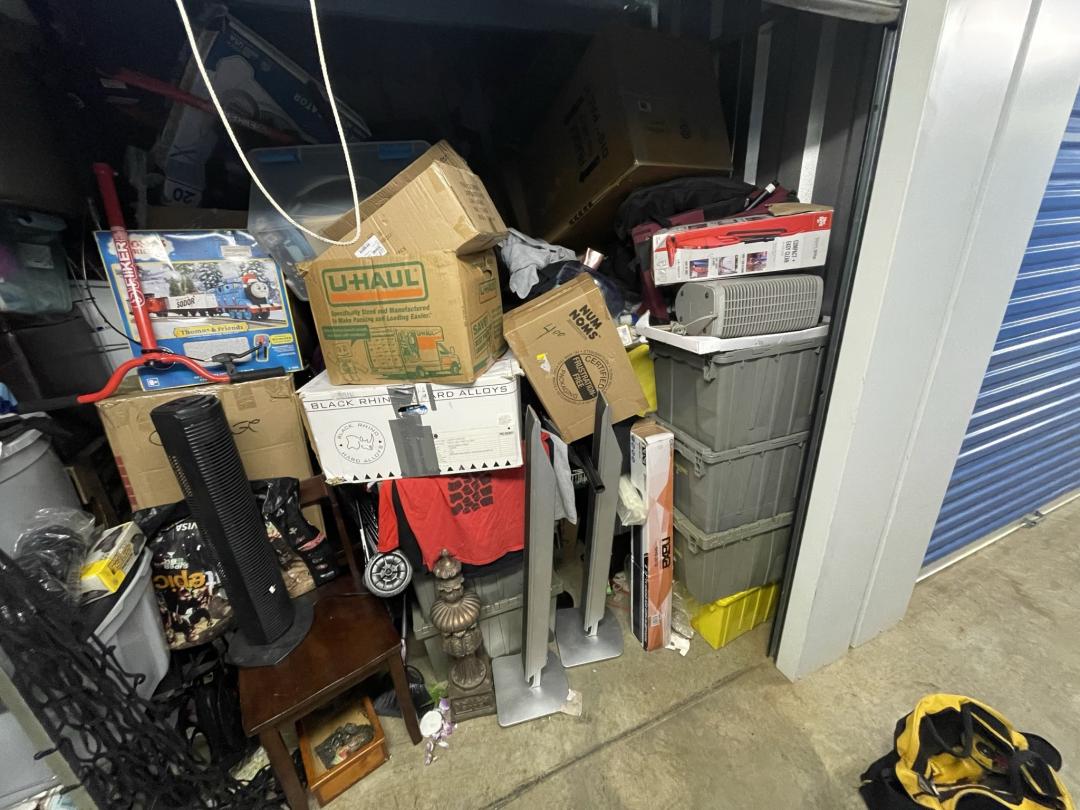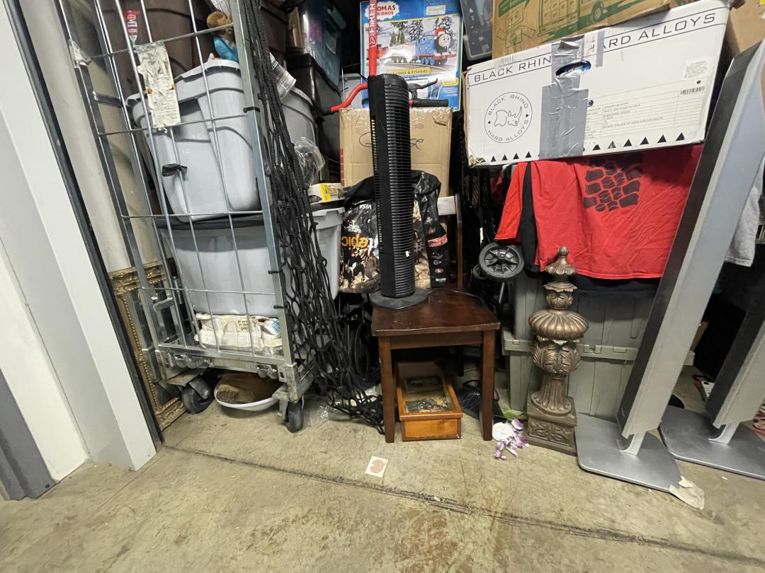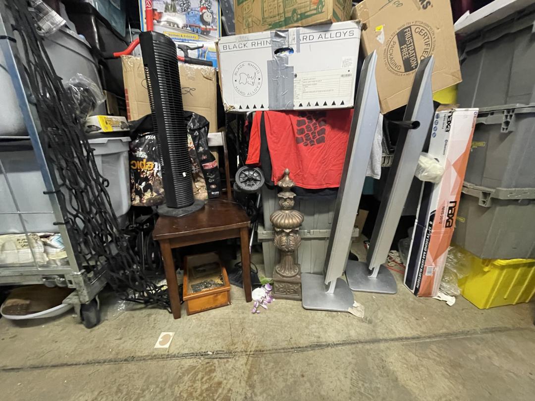 This unit appears to contain…This unit contains boxes, totes, a tower fan and a lamp shade.