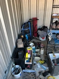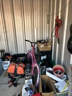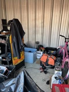This unit appears to contain…toolbox, auto parts, bikes, tools, power tools, plastic totes, plastic bags, misc boxes, clothing, suitcases, misc items, space heater, gasoline container, guitar and stand, vacuum cleaner