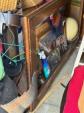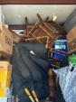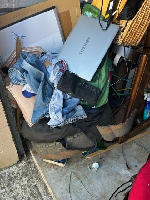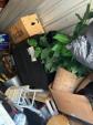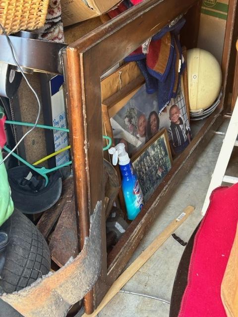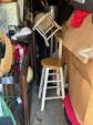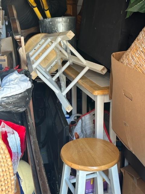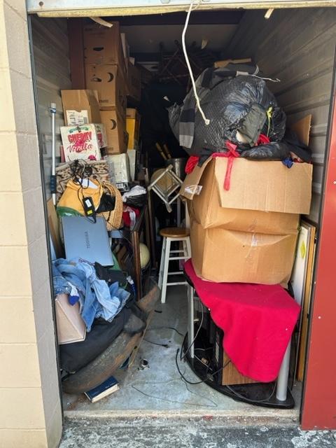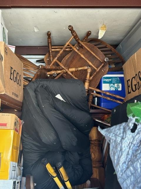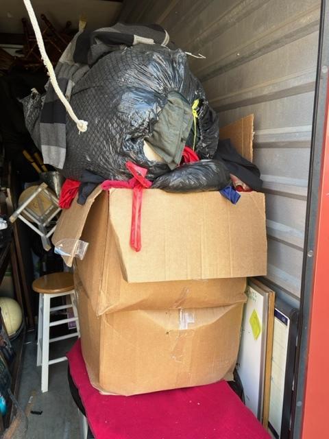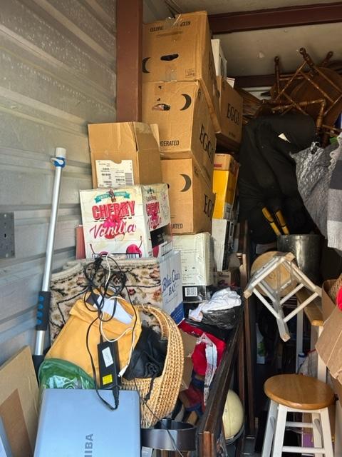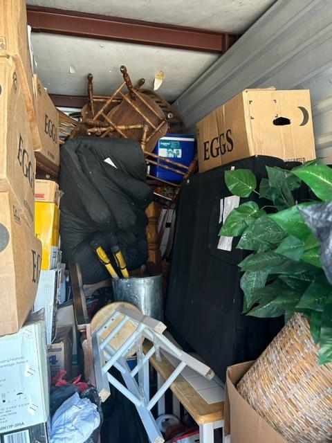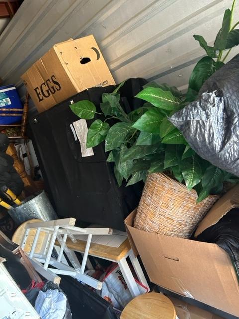 This unit appears to contain…Boxes, bags, kitchen table, chairs, bar stools, laptop, tv stand, clothes, tire, pictures, rug, dry erase boards, cooler, futon mattress, artificial plant, tv, and microwave
