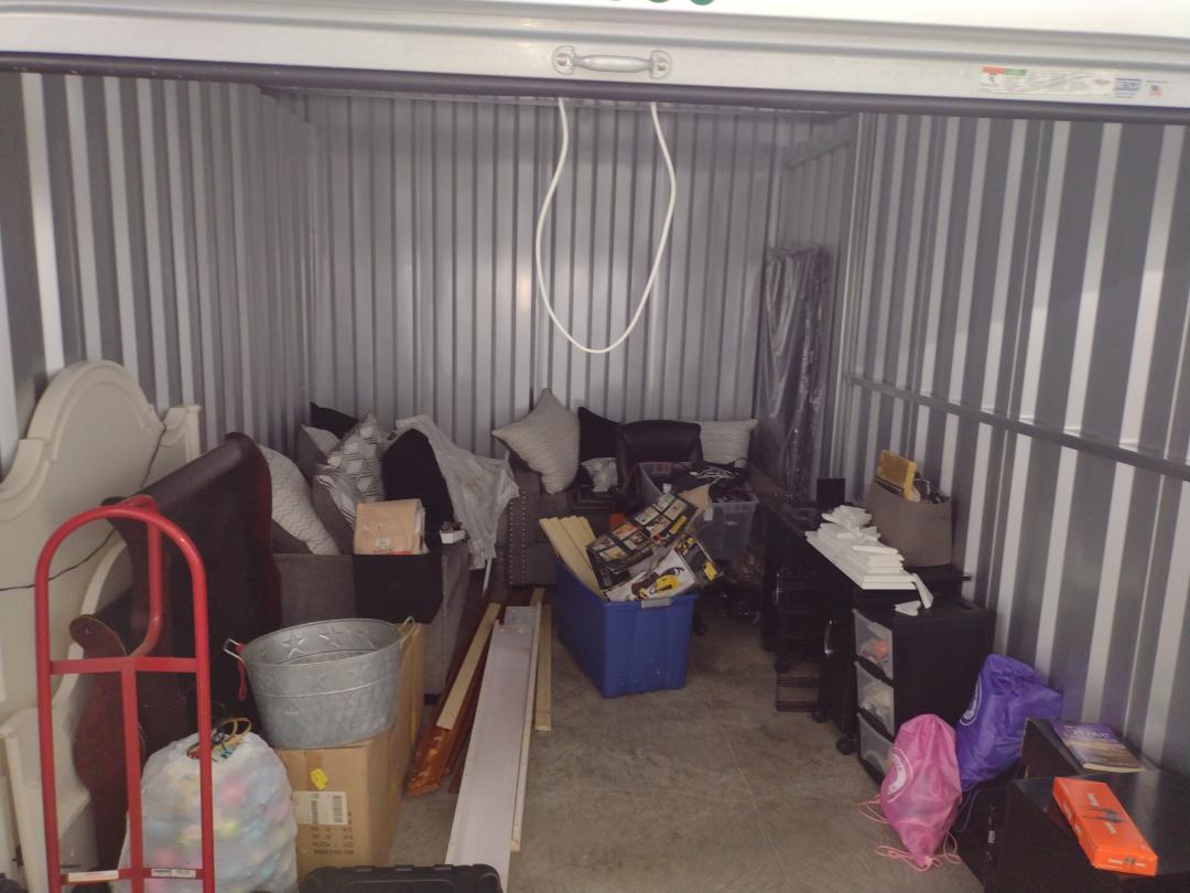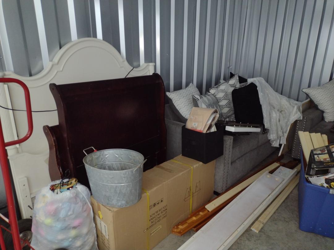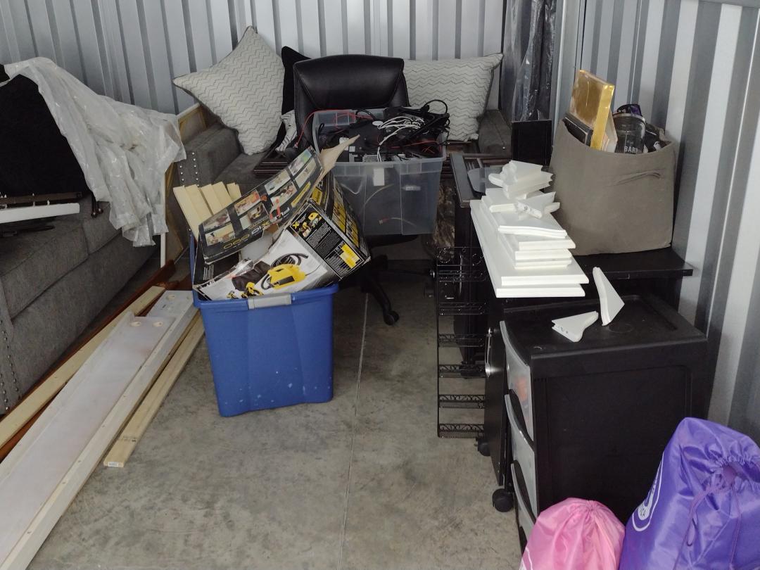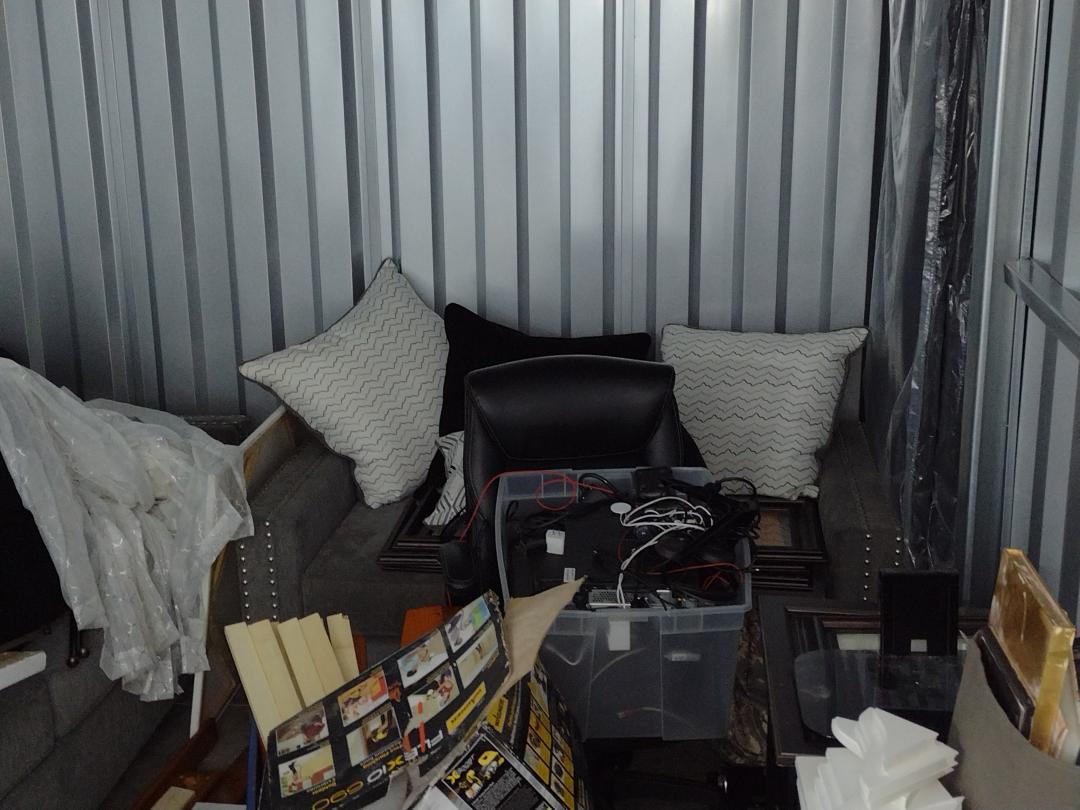 This unit appears to contain…Dolly/hand truck, plastic totes, plastic drawers, couch, head board/footboard, pillows, tools, heavy duty plastic cases, christmas ornaments, office desk, misc. houshold items, paint sprayer, electronics, misc. shoes ( Nike brand)