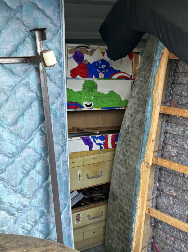 This unit appears to contain…Beds Box Frame Stove Refrigerator Table Chairs Dresser Boxes Washer? Dryer?