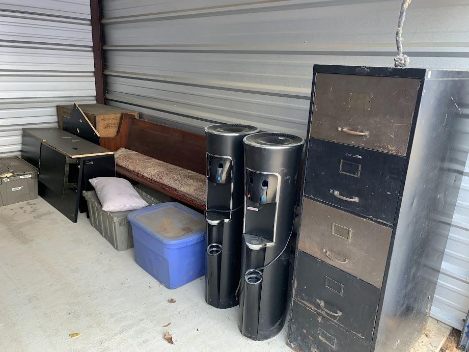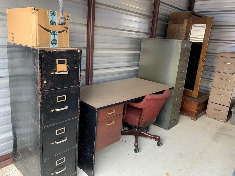 This unit appears to contain…Chifferobe, Desk, File Cabinet x 4, Water cooler x 2, Office Chair, Wooden Crate, totes x3, box