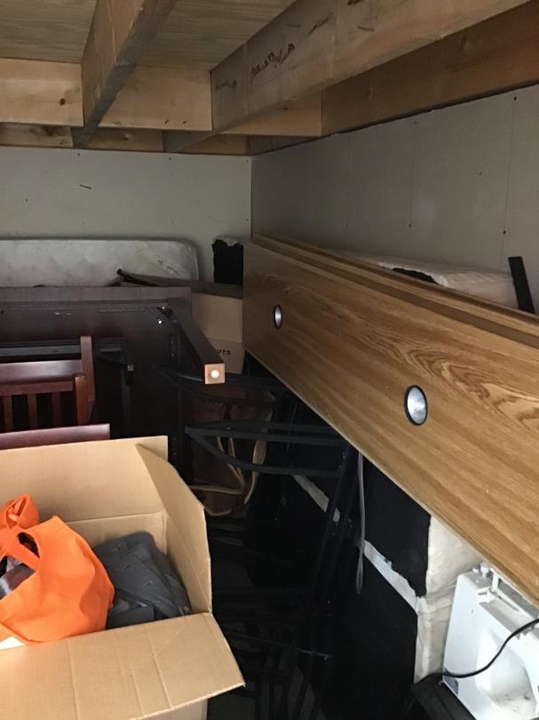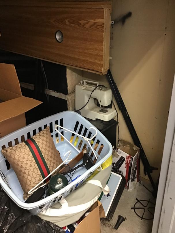 This unit appears to contain…Misc furniture, household goods, totes, bags, sewing machine