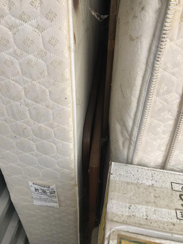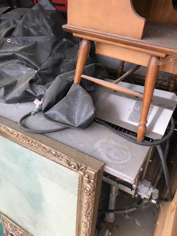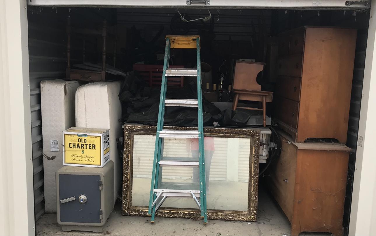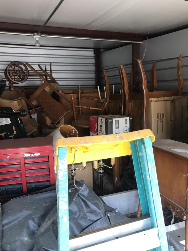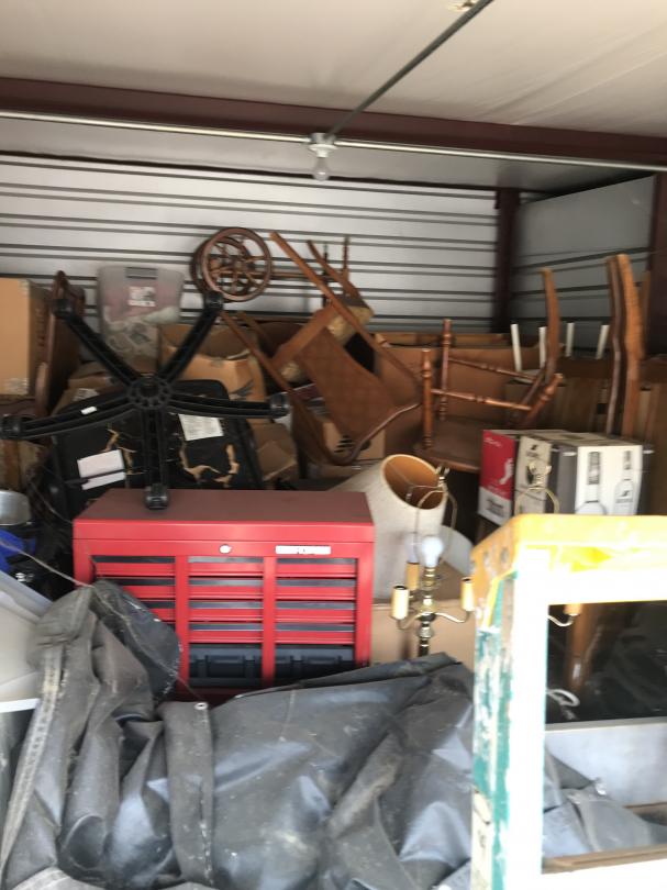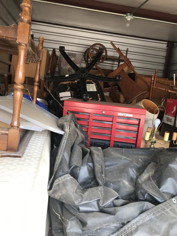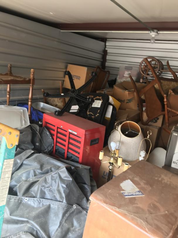 This unit appears to contain…Drive-Up Storage safe, furniture, ladder, big mirror, mattress, box springs, grill, lamp, side table, toolbox, desk chair, mirror, ladder, chairs, totes, bed frame, boxes,