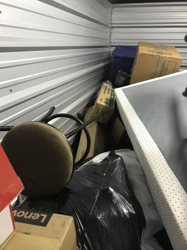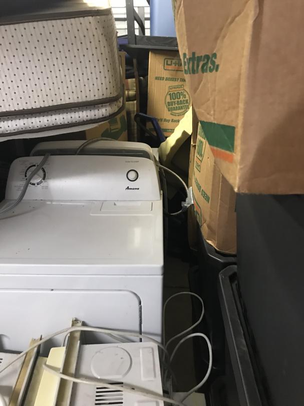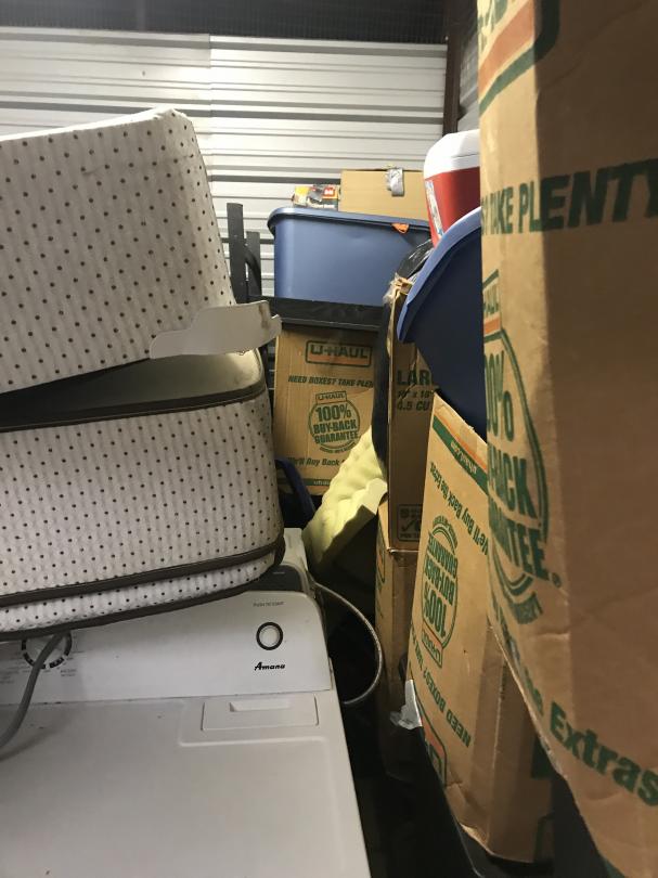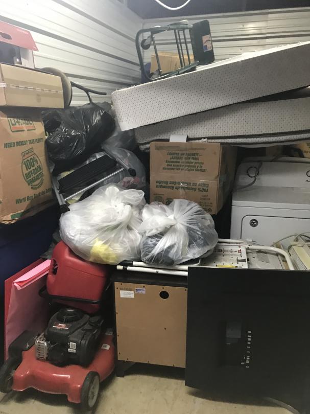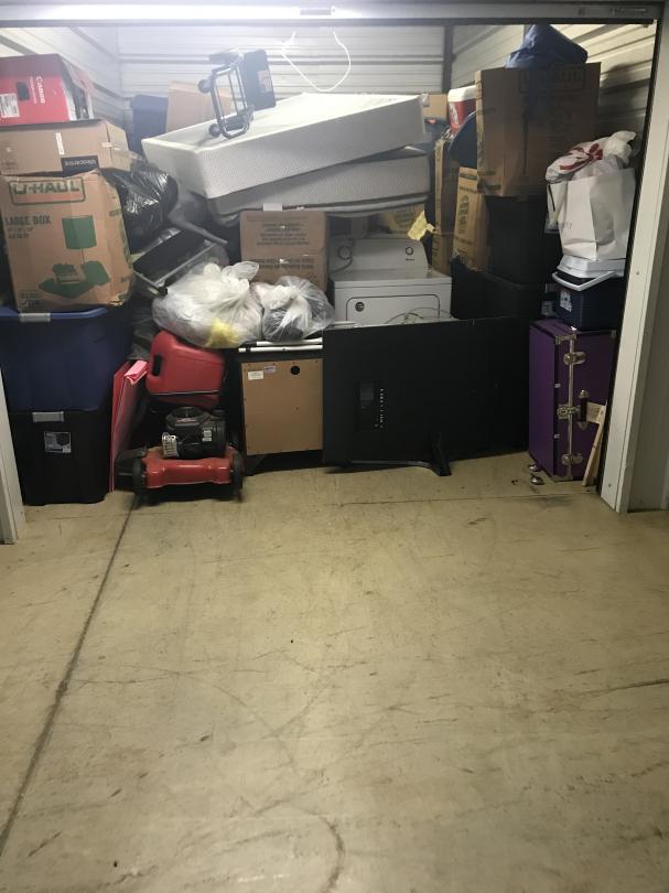 This unit appears to contain…Climate Controlled First Floor dolly, mattress, box springs, push mower, tv, ice chest, dryer, washer, boxes, 3 ac units, locker, stool, totes,