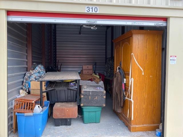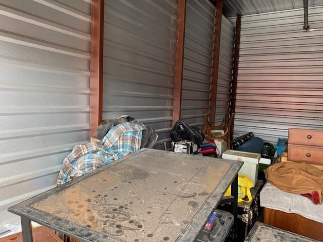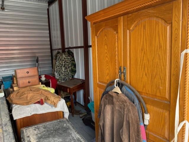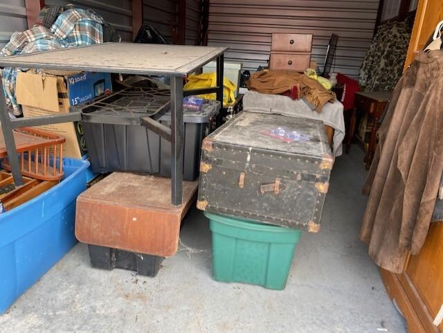This unit appears to contain…Unit appears to contain, clothing, jacket, boxes, armoire, large desk, large coffee table, chairs