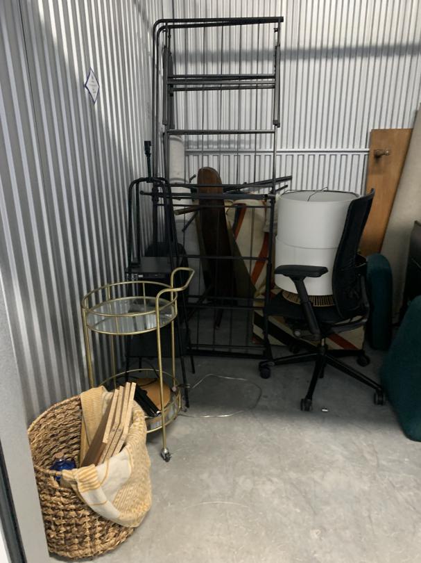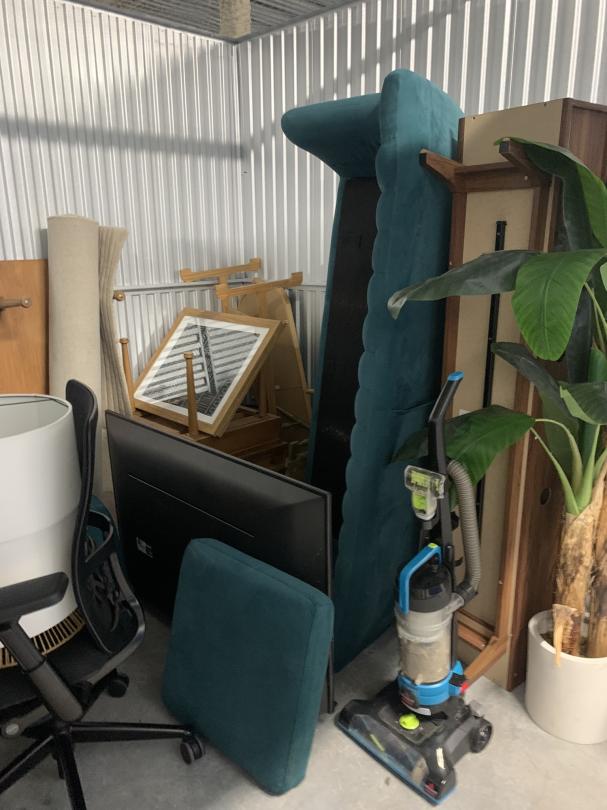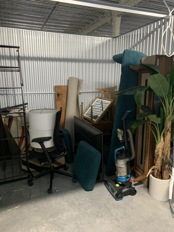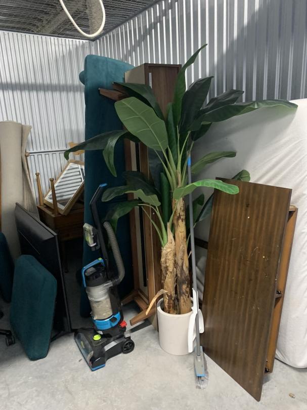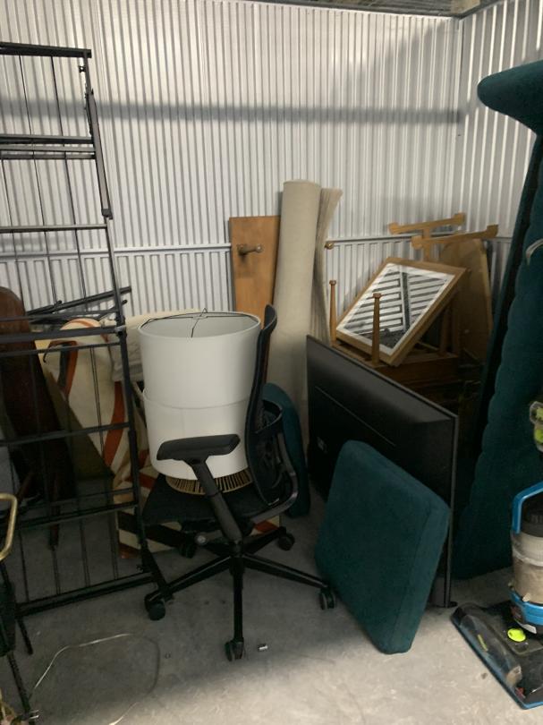 This unit appears to contain…rug, mattress, silk plants, vacuum, tv, end tables, tire, lamp shade, framed art work, mirror, coffee, chair and ottoman