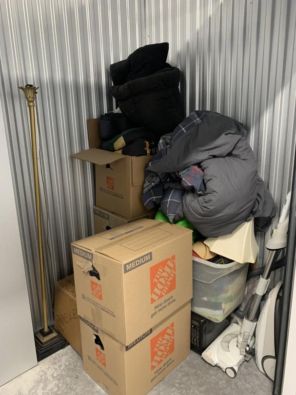 This unit appears to contain…desk, chair, boxes, sleeping bags, vacuum, lamp base, microwave, totes