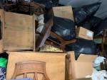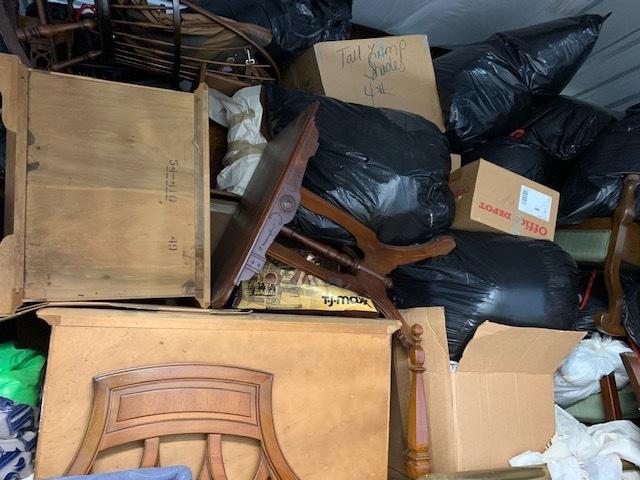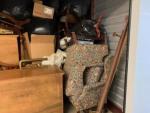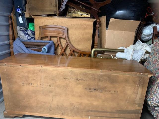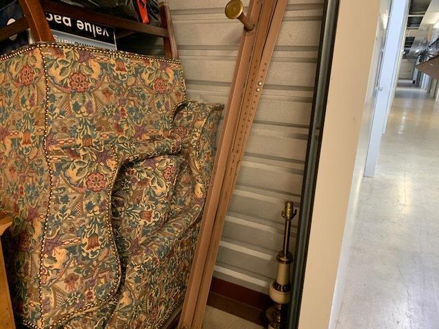 This unit appears to contain…Climate Controlled Upper Floor 2 upholstered chairs, wood dresser, brass bed, wood chest, wood rocking chair, luggage, lamps, bed rails , wood head board