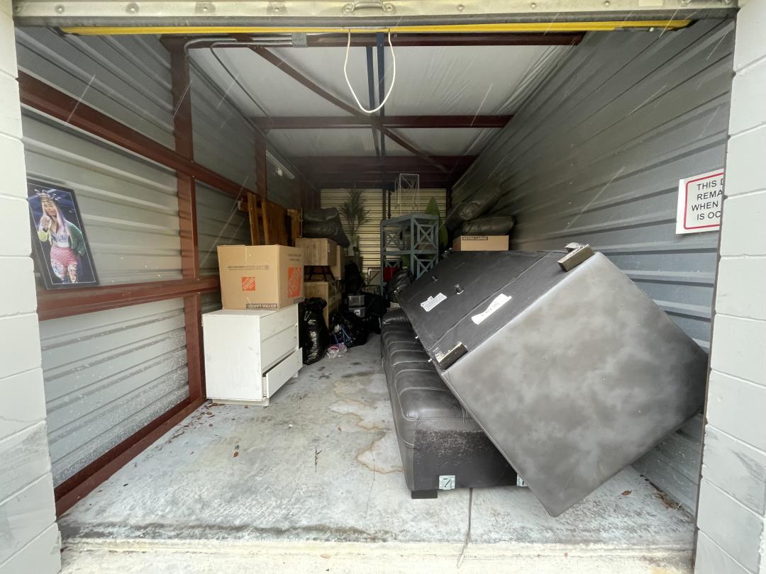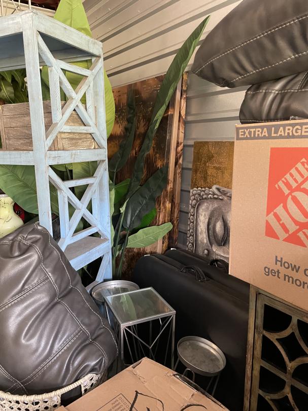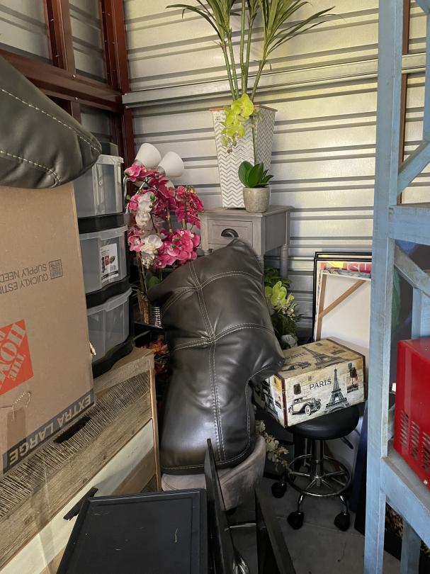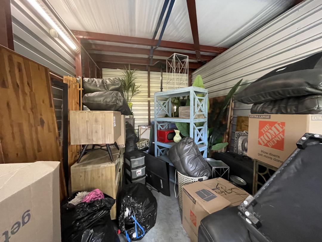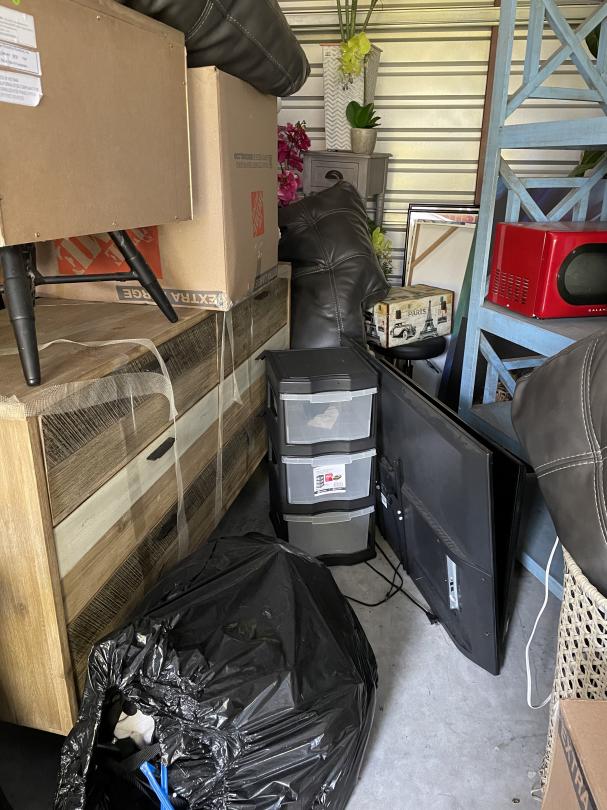 This unit appears to contain…BAGS, BINS, BOXES, DRESSER, MICROWAVE, NIGHTSTAND, SOFA, TV, FOLDING TABLES, MIRROR, WALL ART, FEAUX PLANTS
