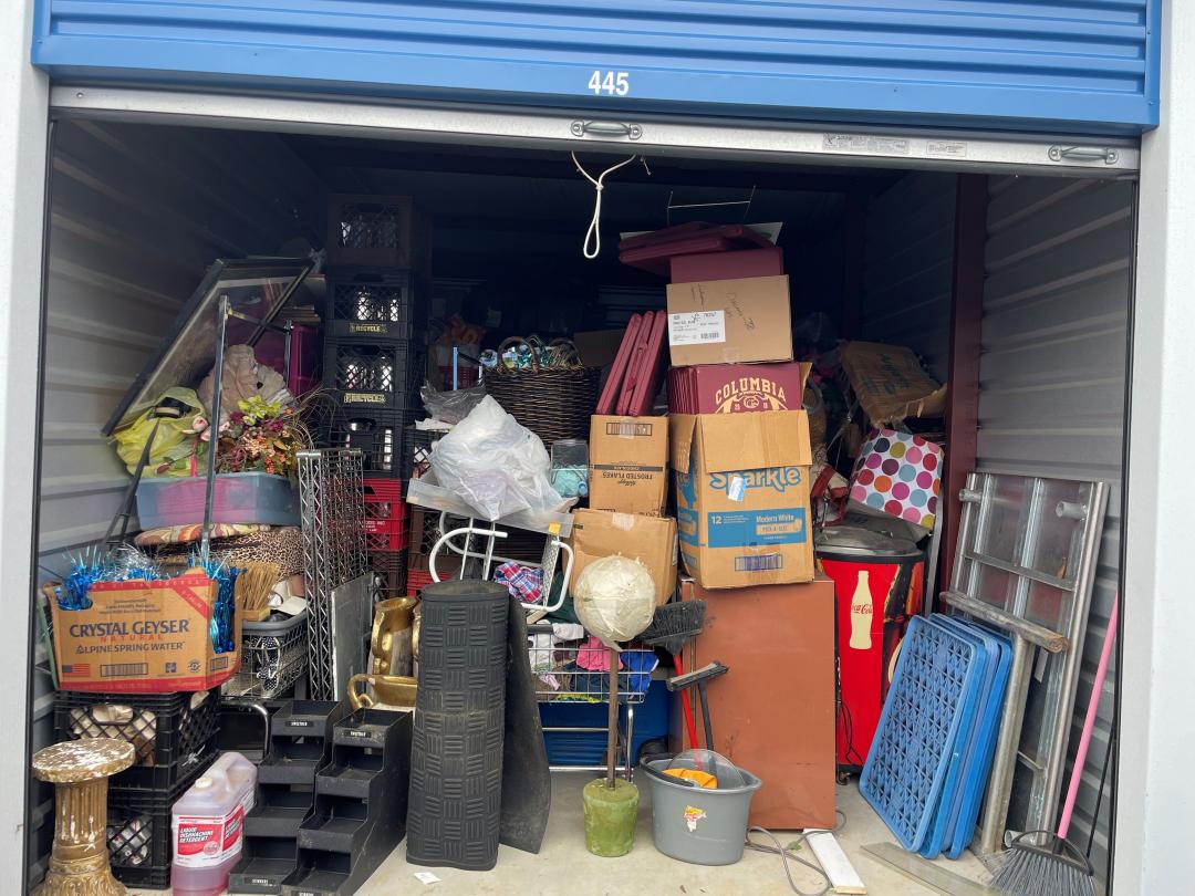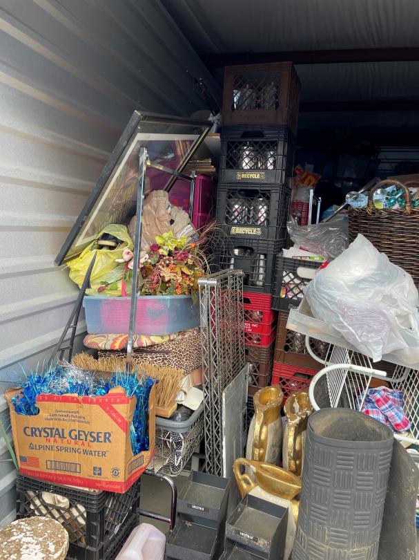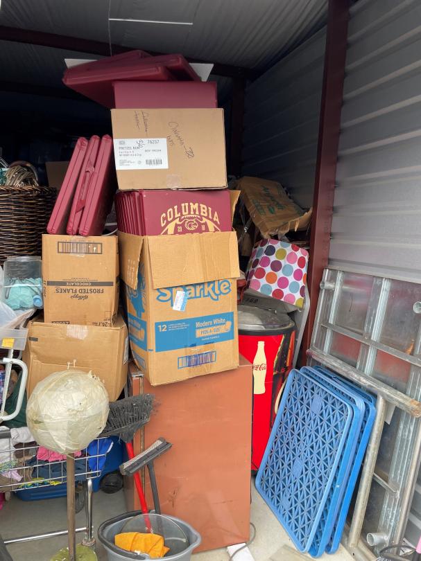 This unit appears to contain…Catering Equipment, Tea Pitchers, Multiple Totes, Mini Fridge, Decor, Pictures, etc.