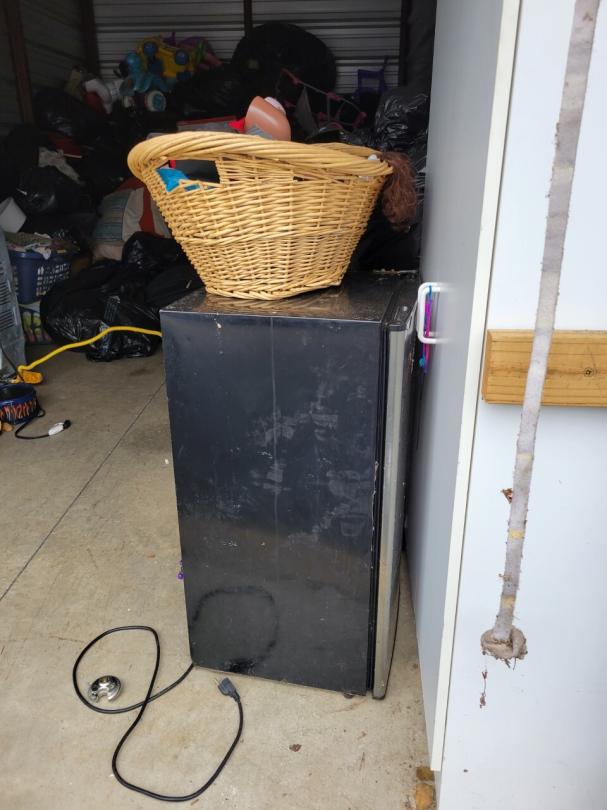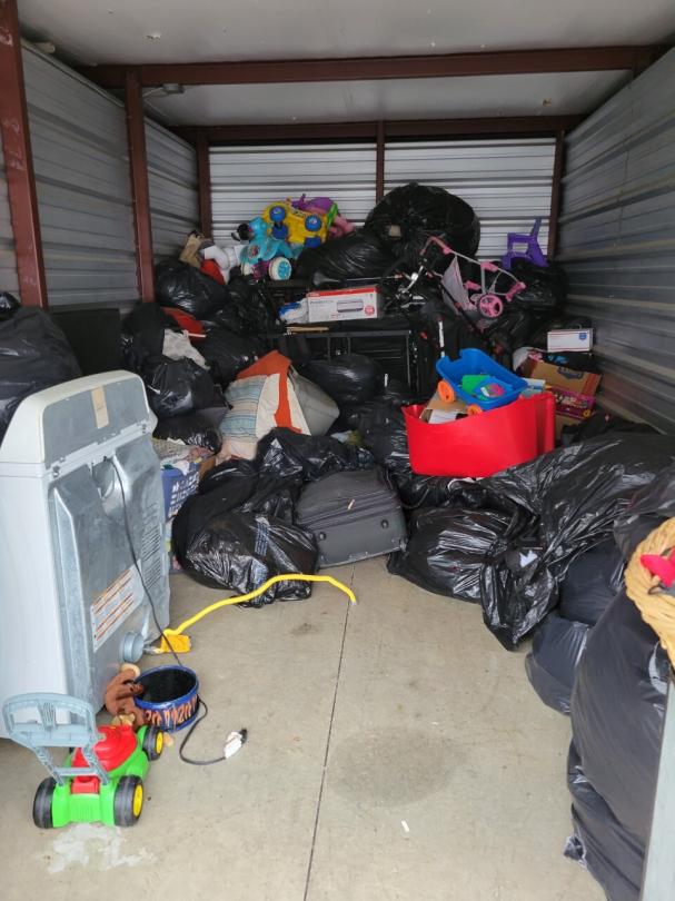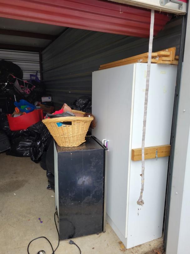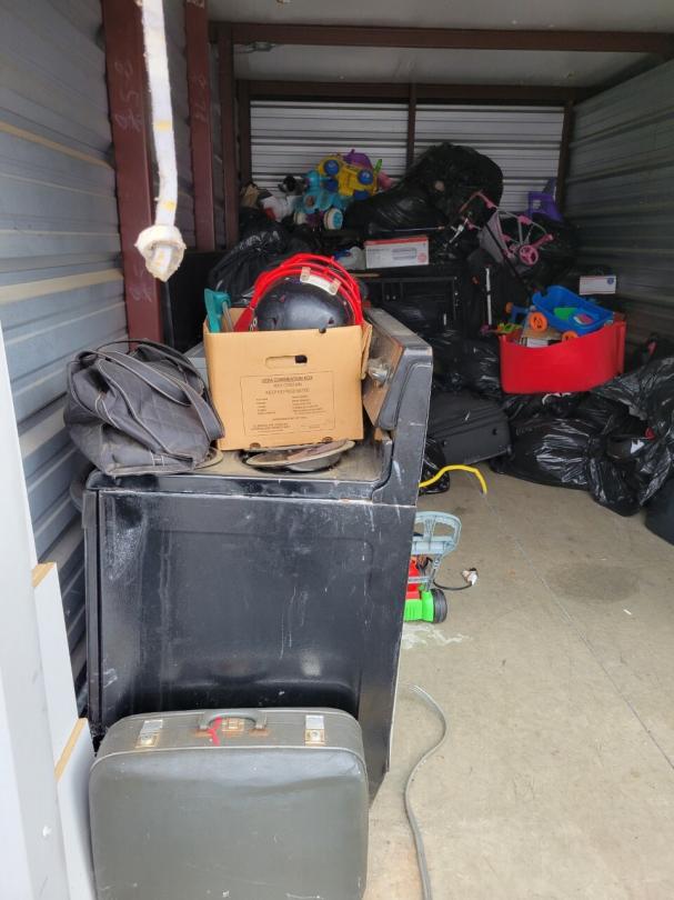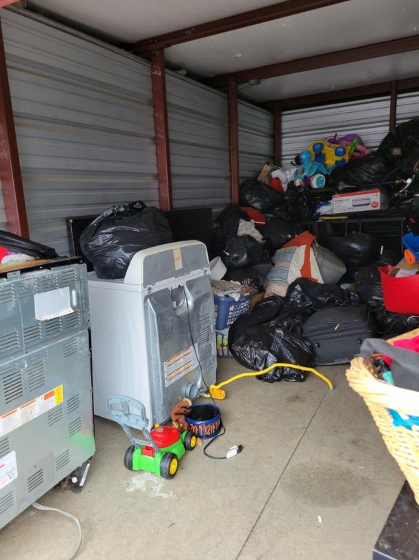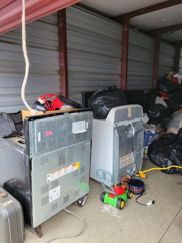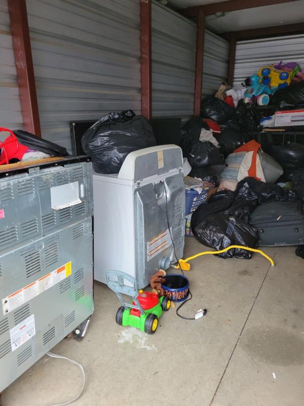 This unit appears to contain…Dryer, stove, Freezer/Refrigerator, shelving, plastic bags, Misc. Boxes, Clothing, Suitcases, Laundry baskets, Toys, bike