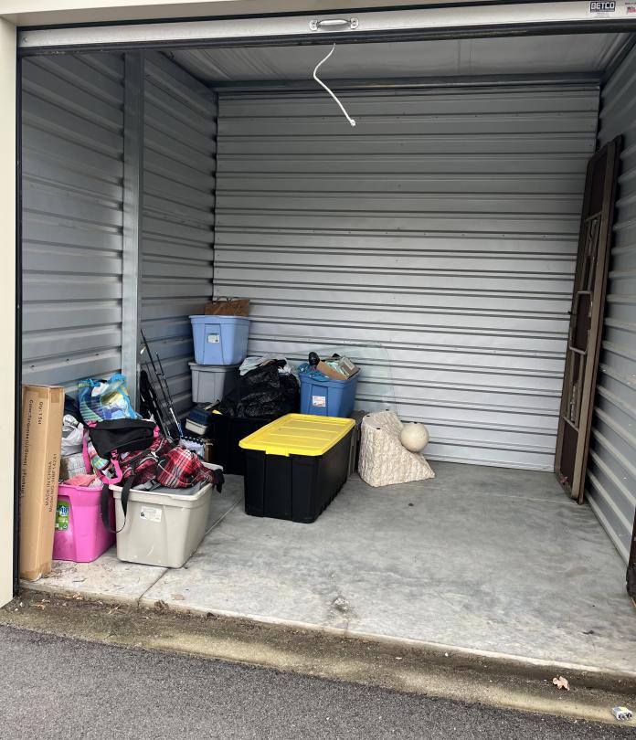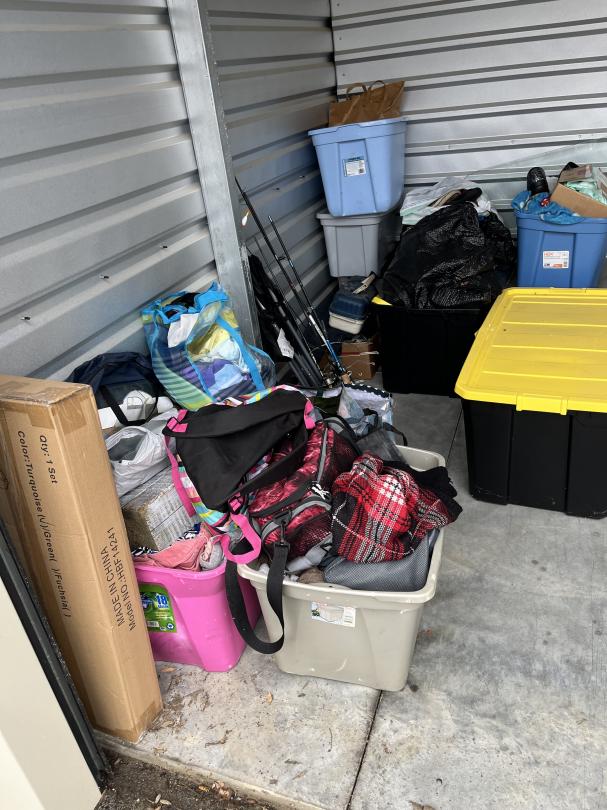 This unit appears to contain…tables, fishing poles, backpacks, clothes, totes, shoes, artwork