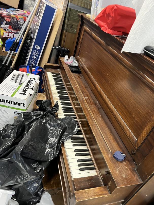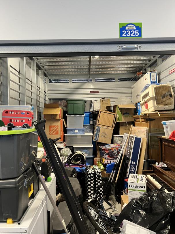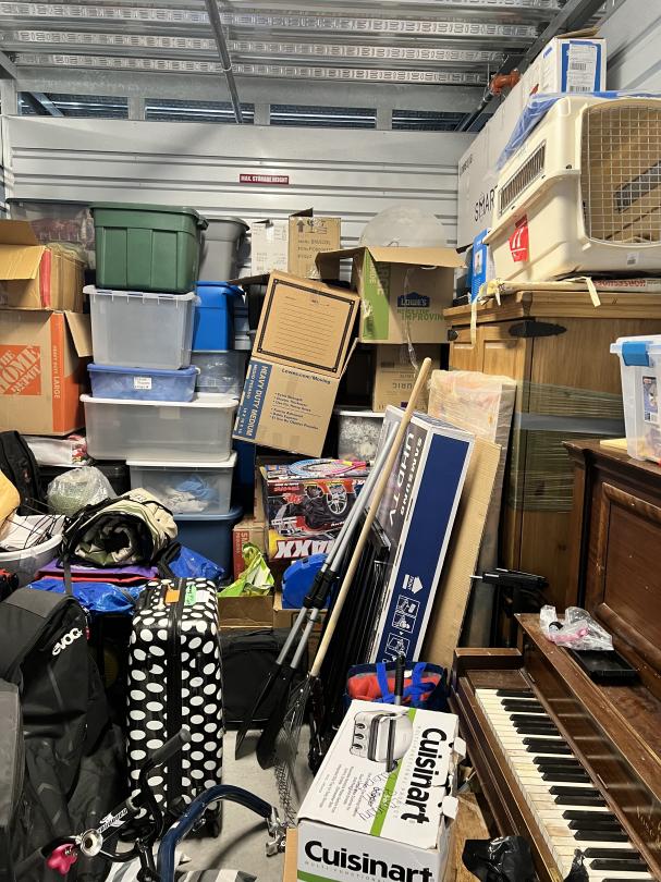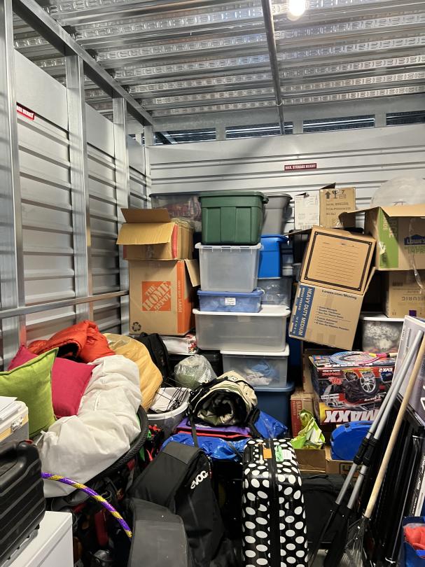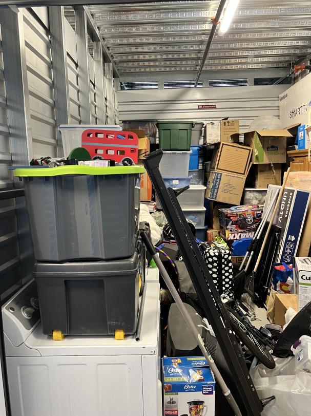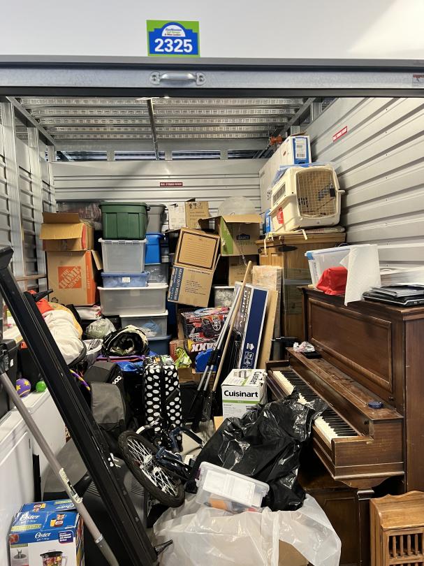 This unit appears to contain…Boxes, totes, washer/dryer, tv, bike, pillow, rug, hula hoop, piano, rake, luggage, laptop, kennel