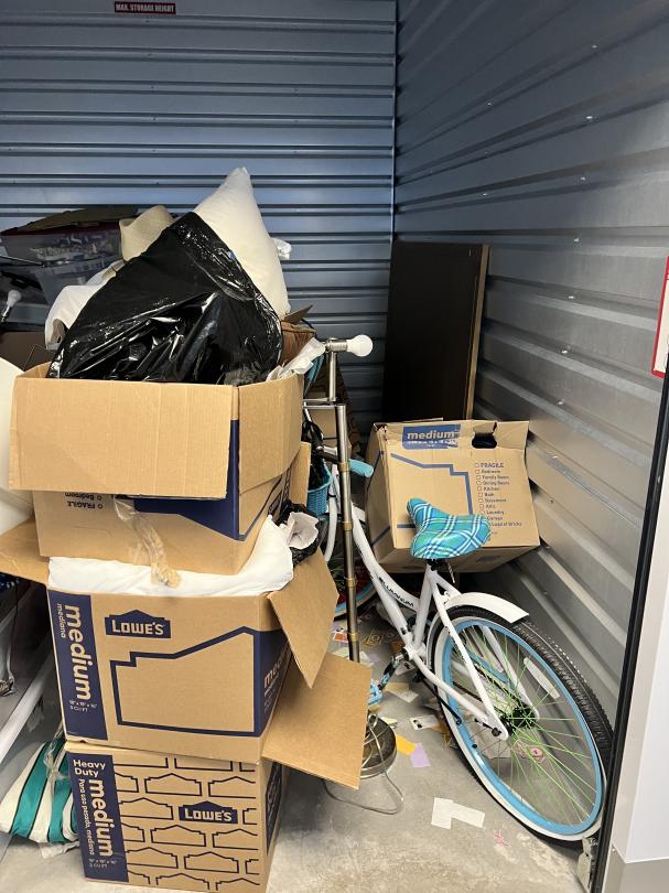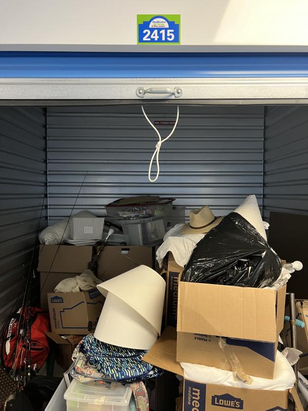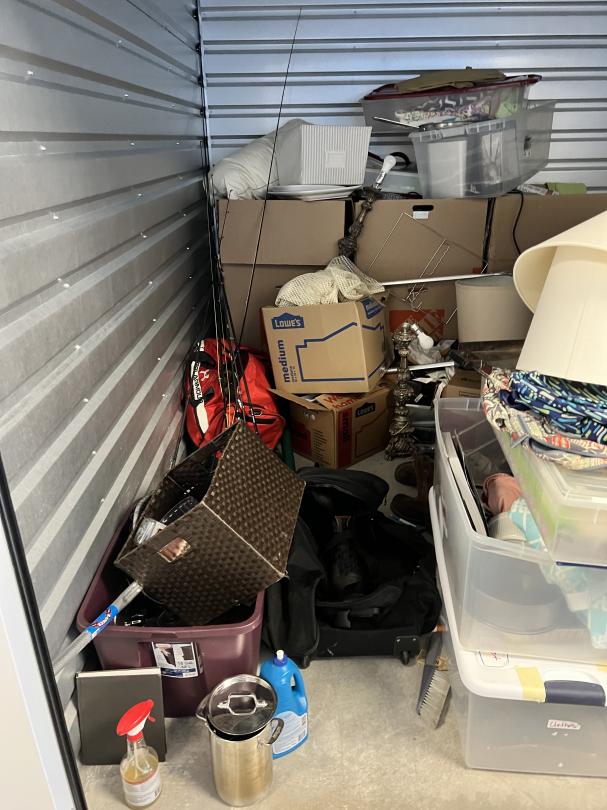 This unit appears to contain…Fishing Poles, Fishing Nets, Books, Artwork, Pillow, Bike, Lamp Shades, Backpacks, Totes, Boxes, Standing Lamp, Bake and Cookware, Duffel Bag
