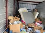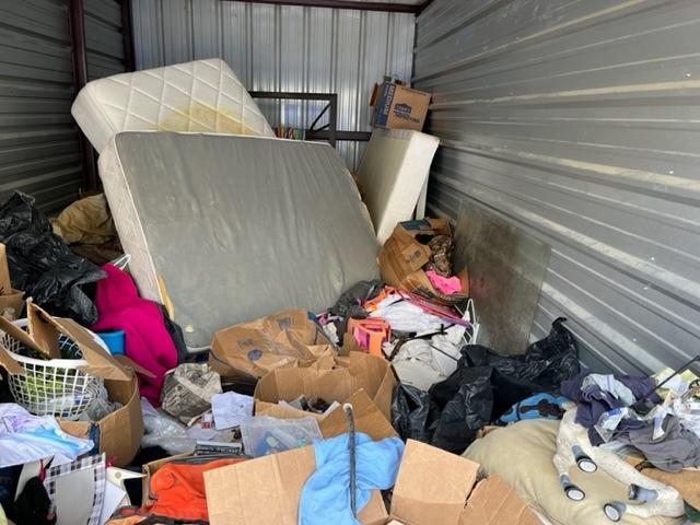 This unit appears to contain…Queen Mattress, Full Mattress, Queen Box Spring, Headboard/Footboard, Outdoor Metal Table with Glass top, Boxes, Totes, Toys, DVDs