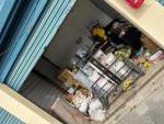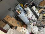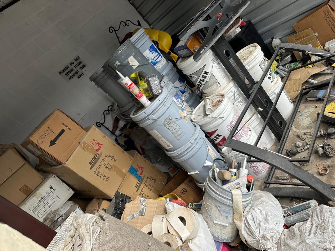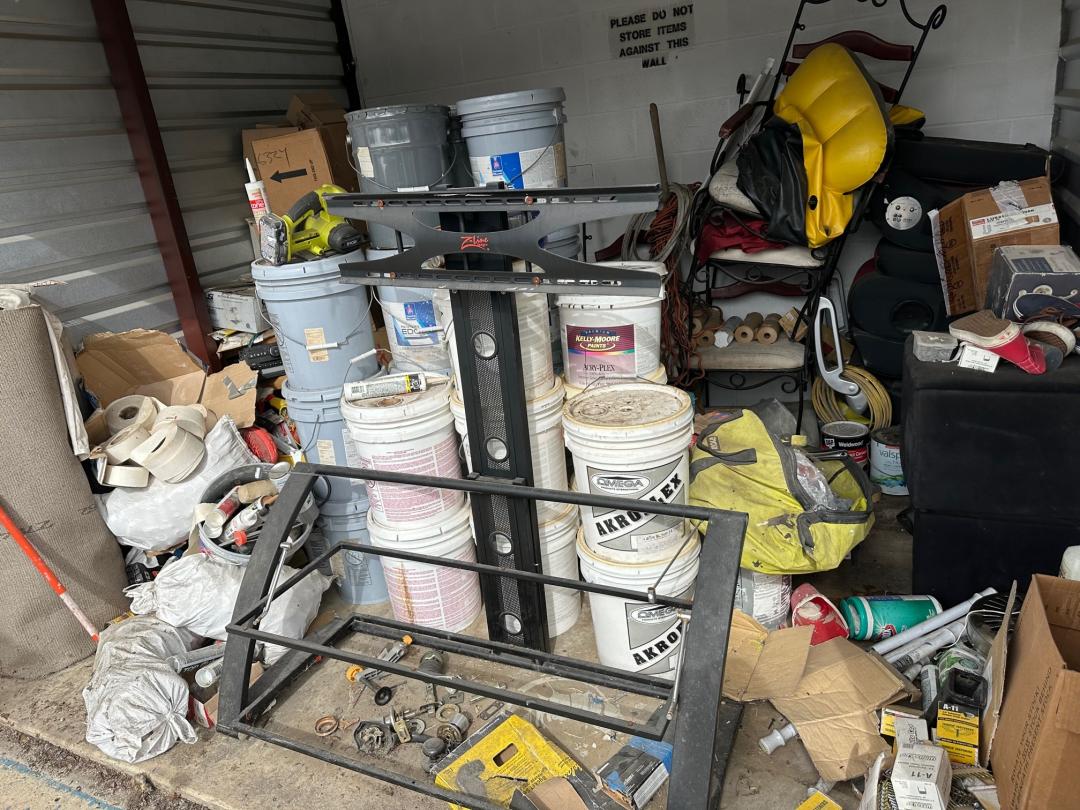 This unit appears to contain…Self Storage- TX 80 boxes, chairs, paint