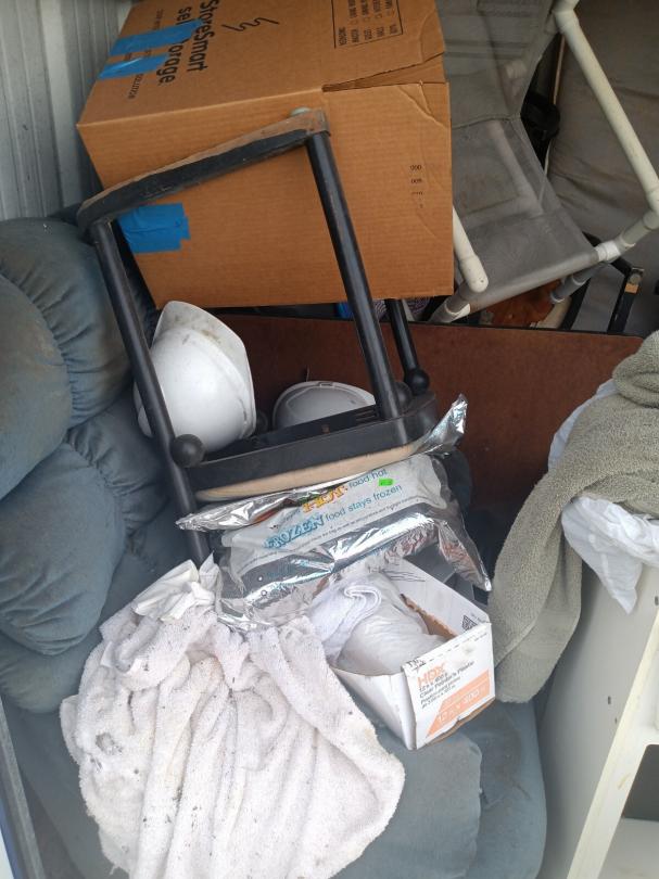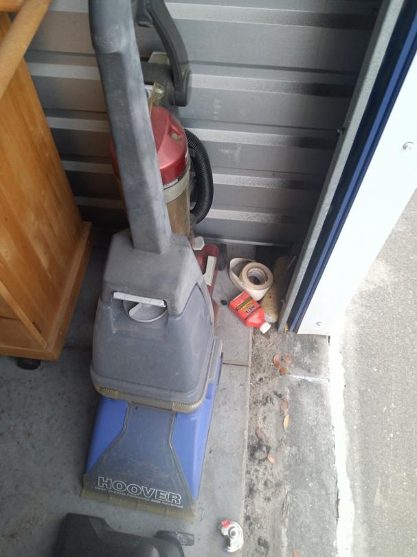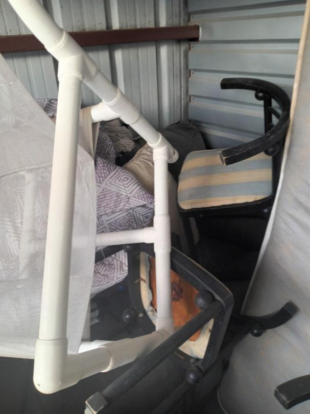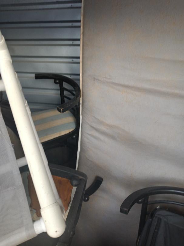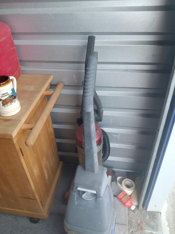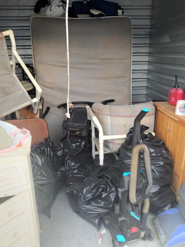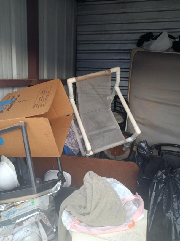 This unit appears to contain…vacuums, mattress,, bags, chairs, small wooden kitchen cart,