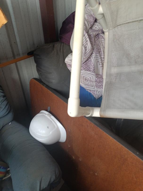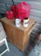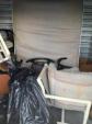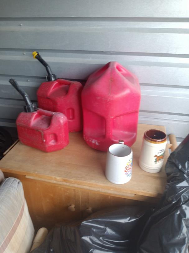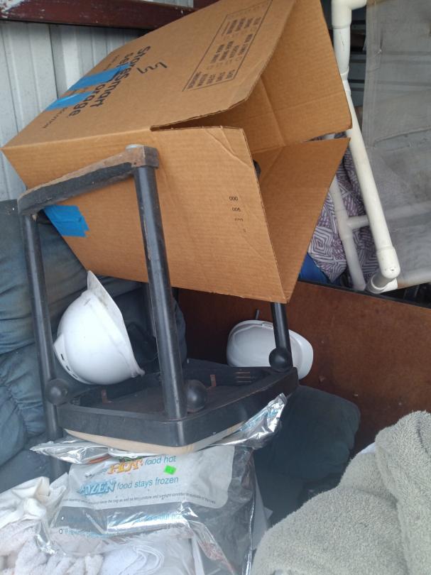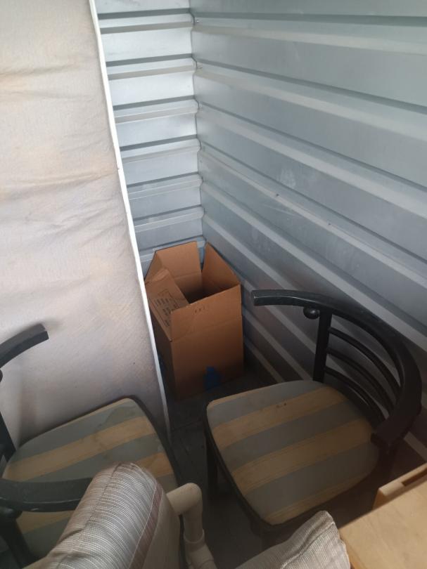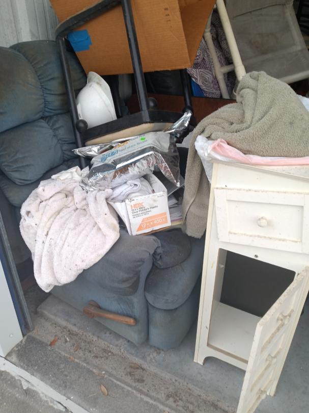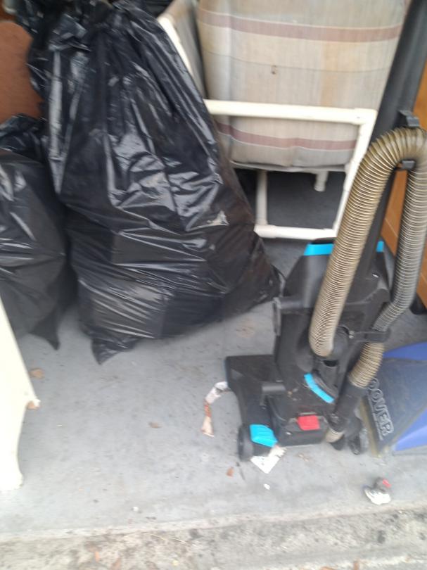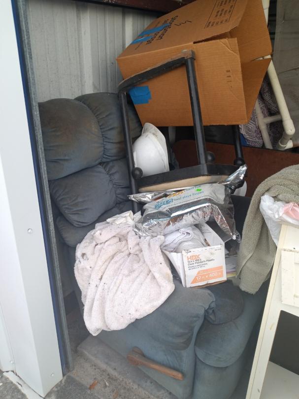 This unit appears to contain…vacuums, mattress,, bags, chairs, small wooden kitchen cart,