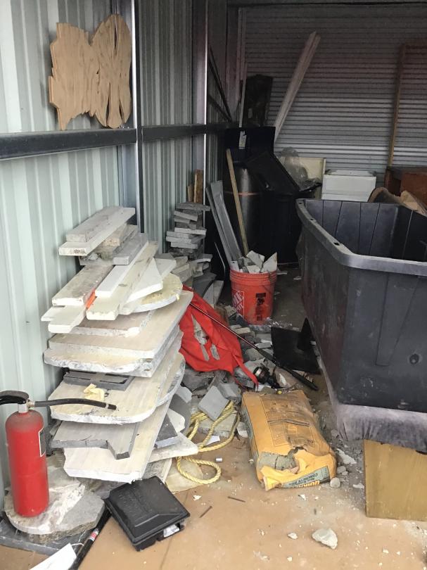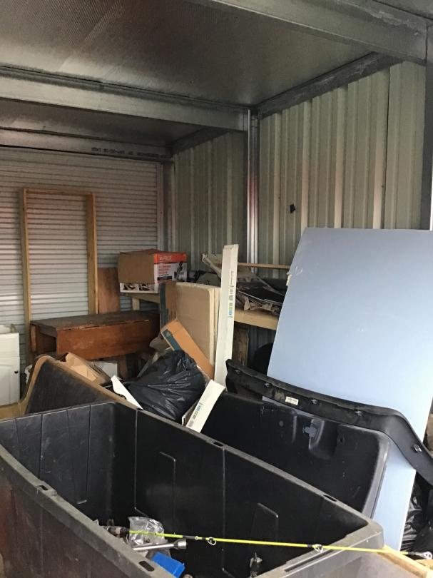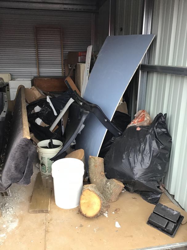 This unit appears to contain…10x15x8 Drive up unit includes woods, church bench, tools, bathroom vanity, granite counter top pieces, table