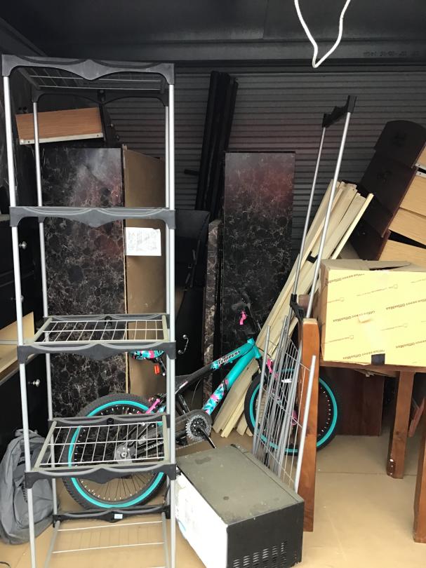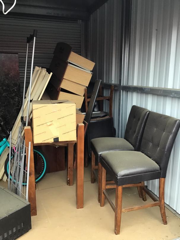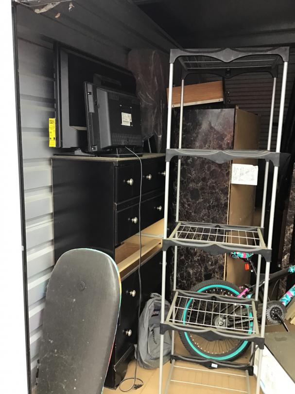 This unit appears to contain…10x10x8 Drive up unit includes tvs, bicycle, furniture, table and chairs etc