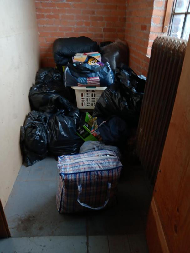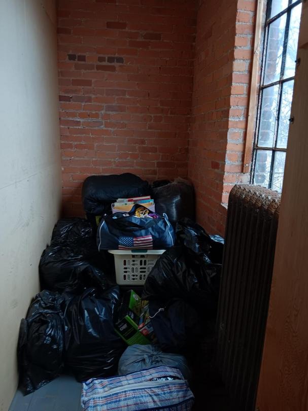 This unit appears to contain…Bag of clothes, Plastic Basket.