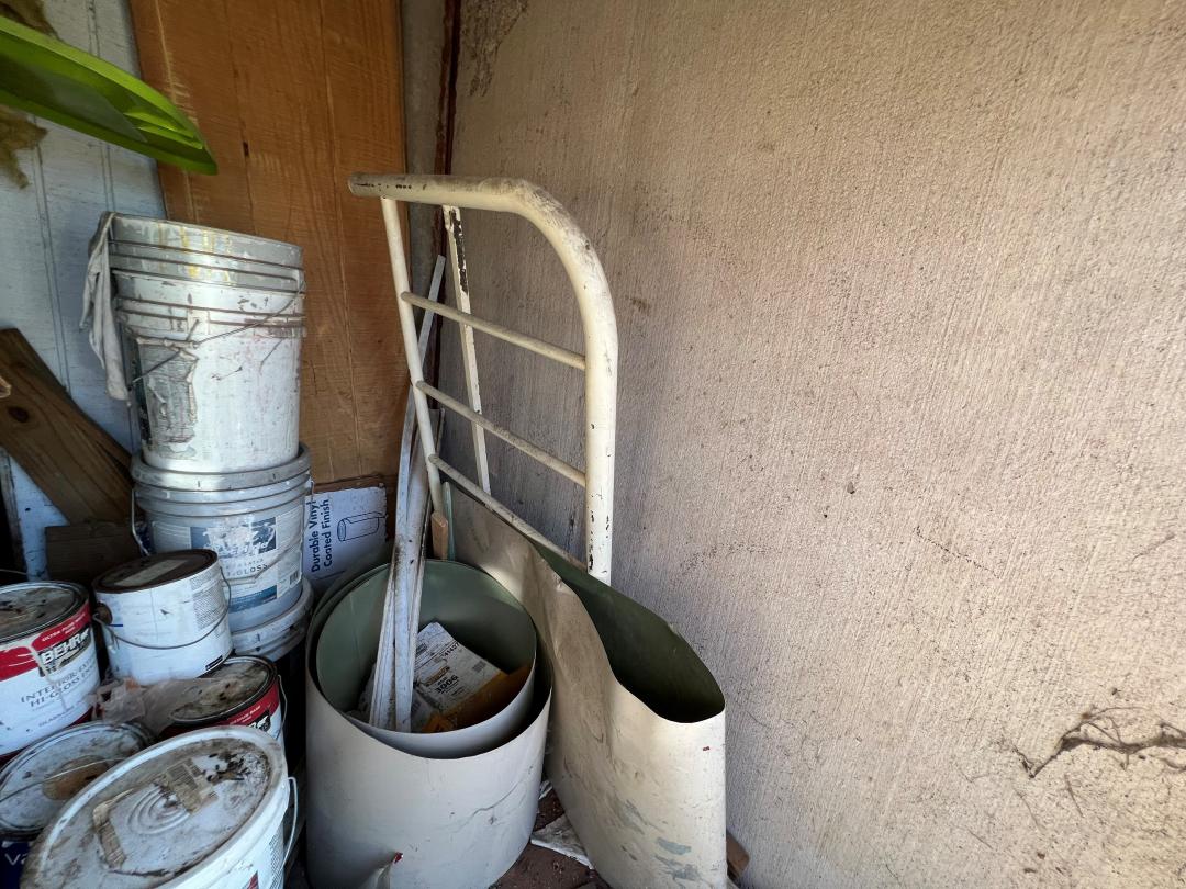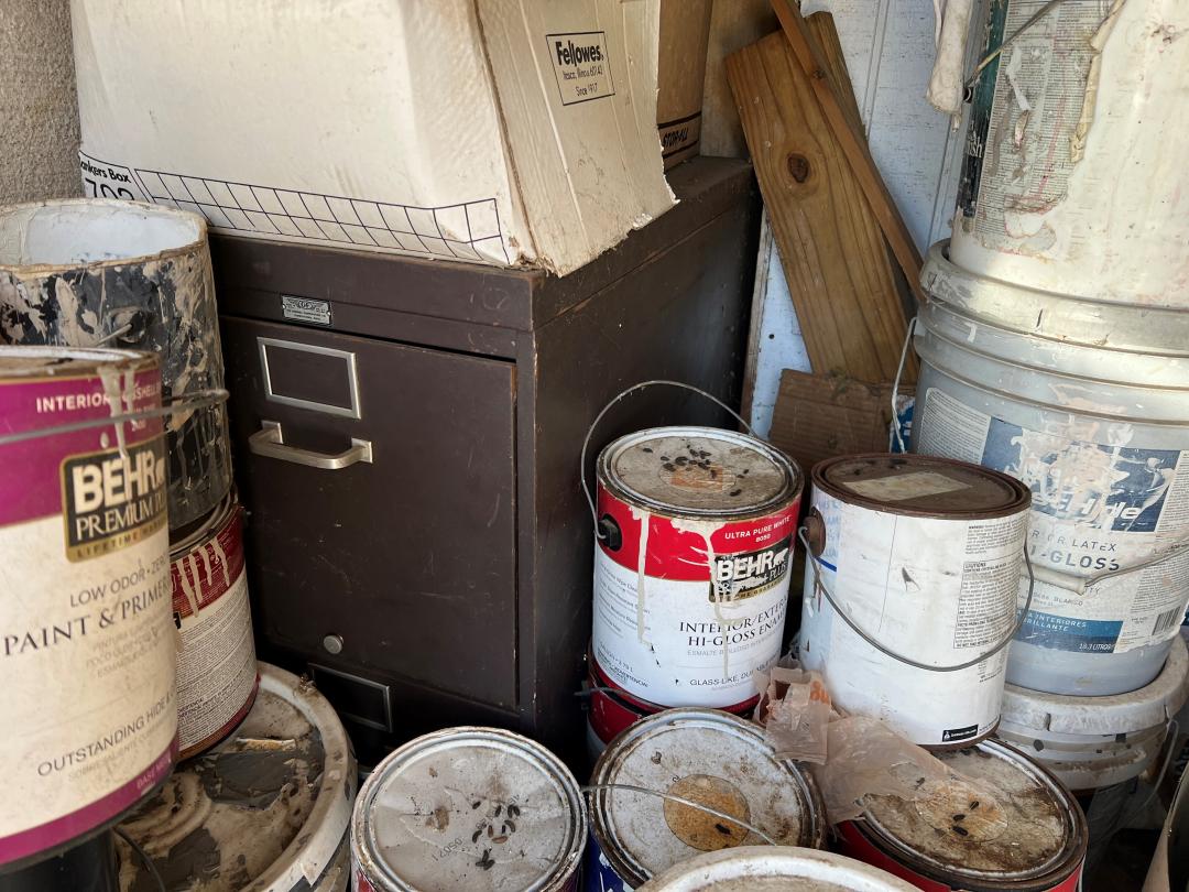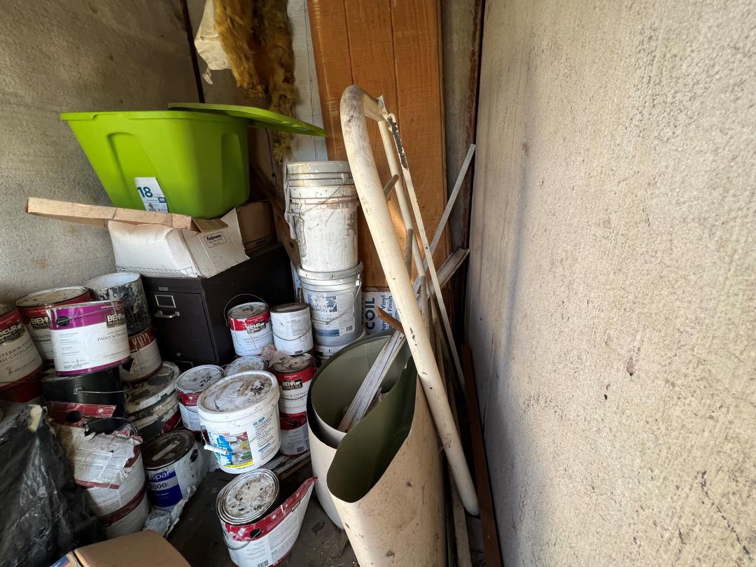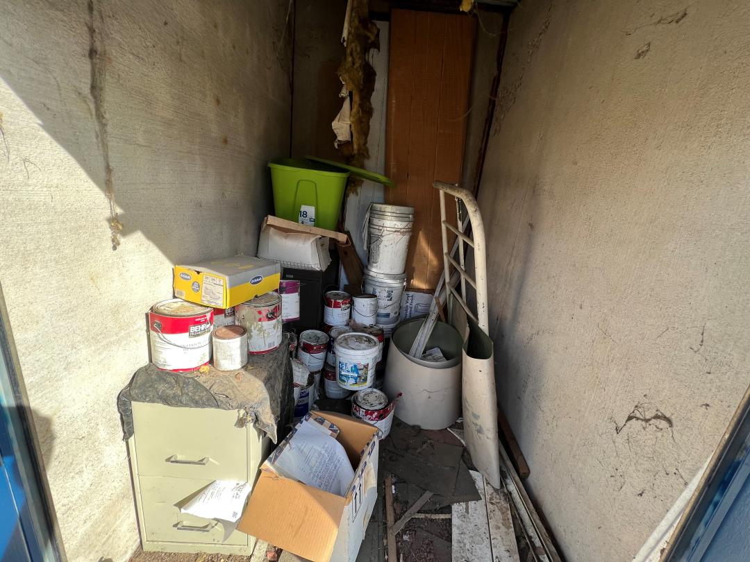 This unit appears to contain…Iron bed, file cabinets, construction materials