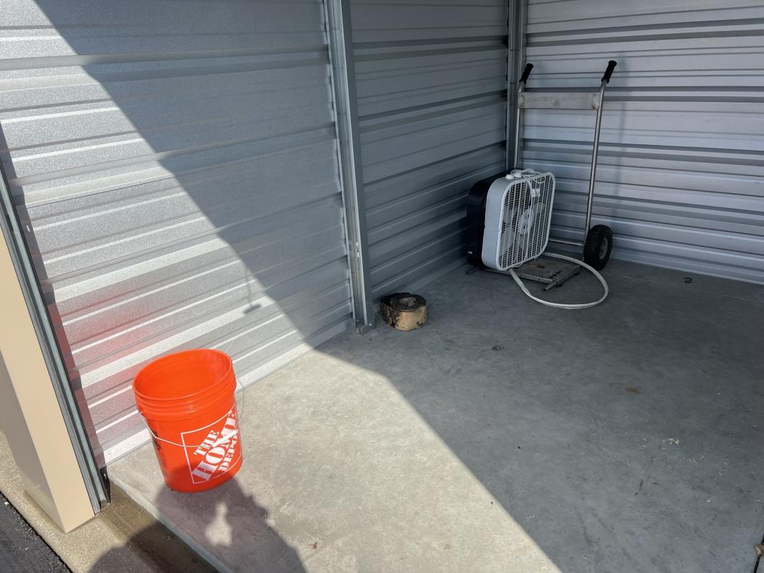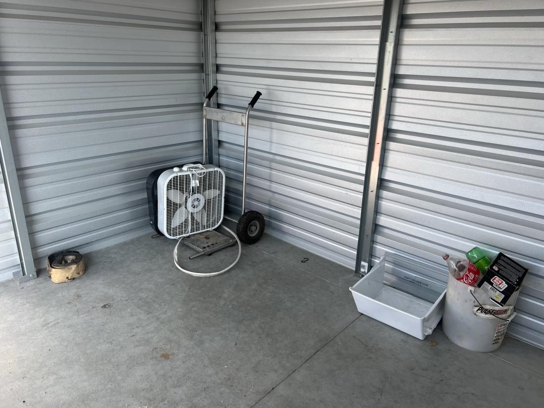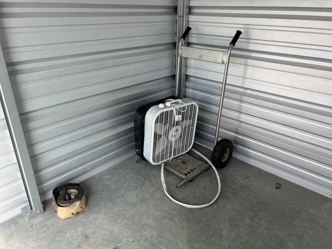 This unit appears to contain…Box fan, buckets, large dolly