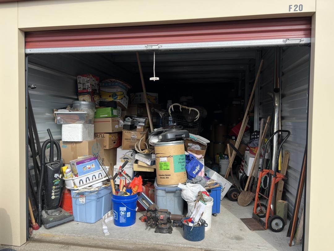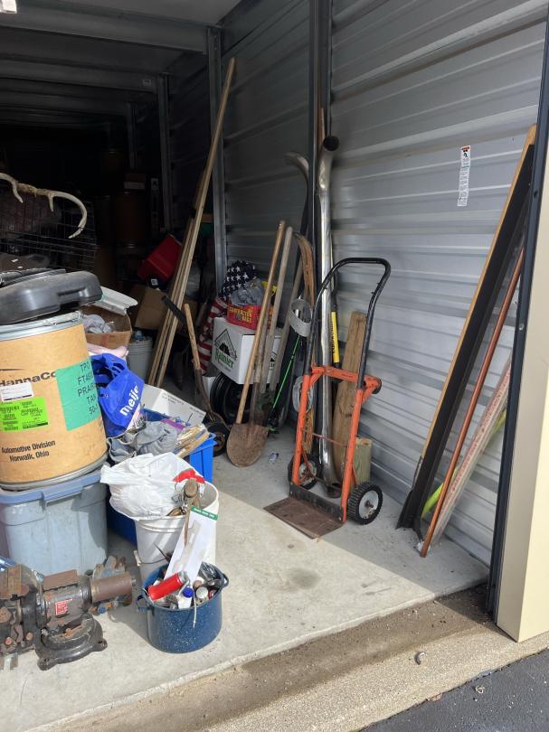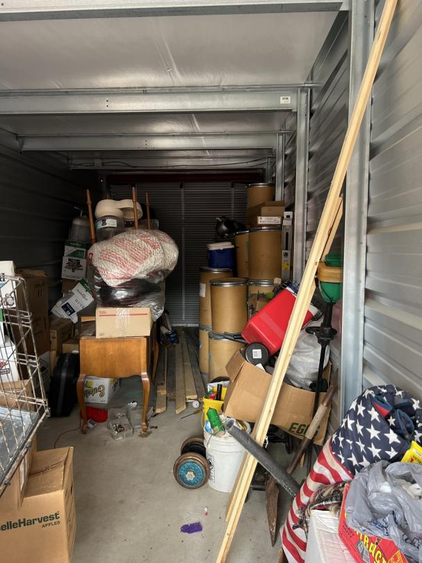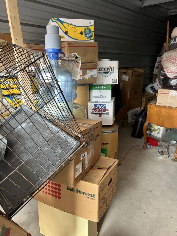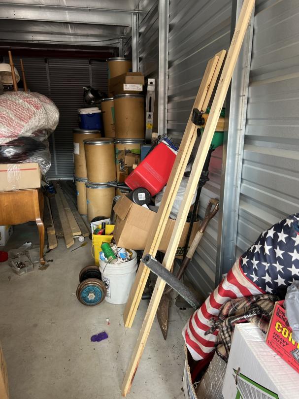This unit appears to contain…Vacuum, boxes, materials, tubs, dolly, furniture, wood, car part, pet cage