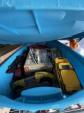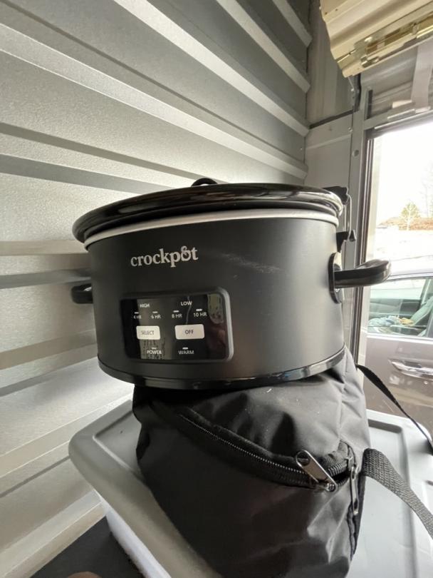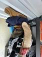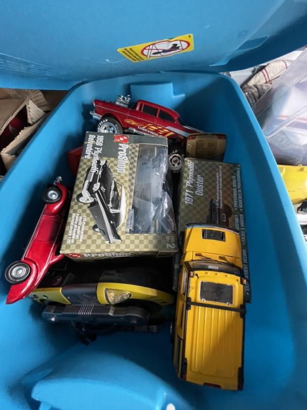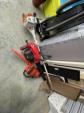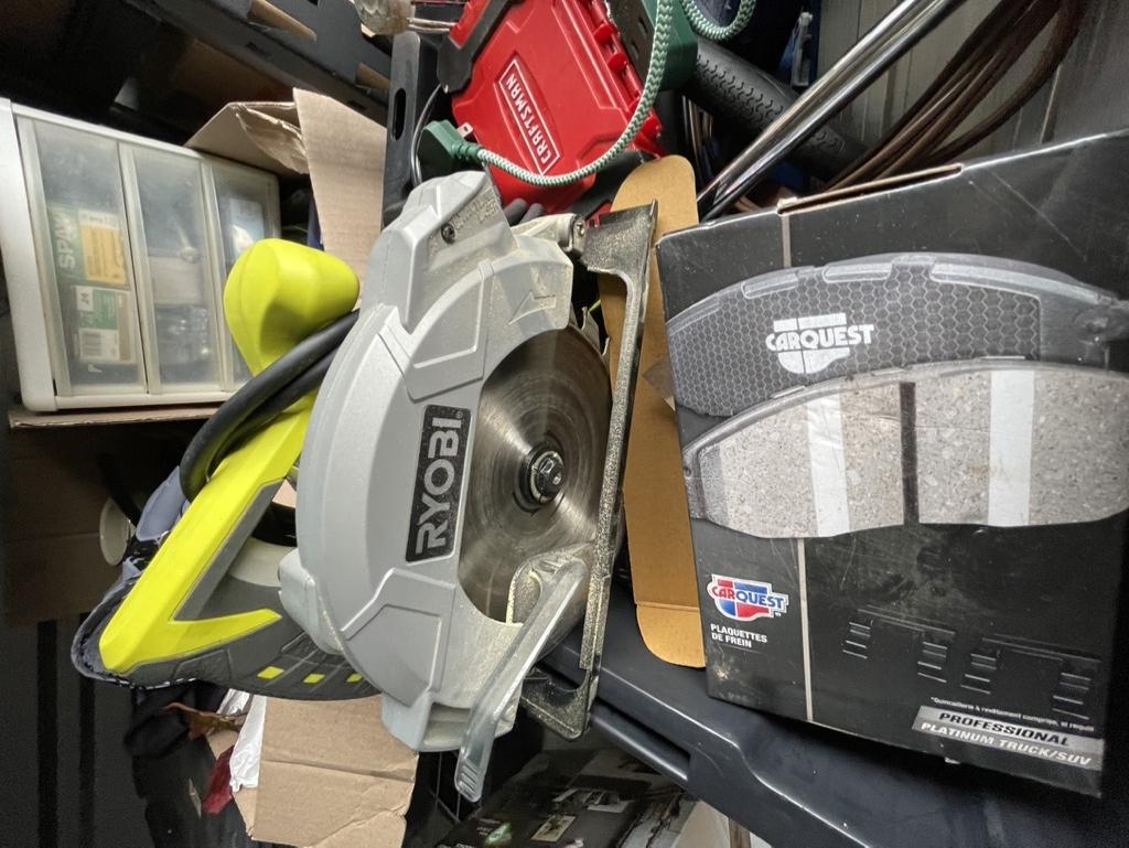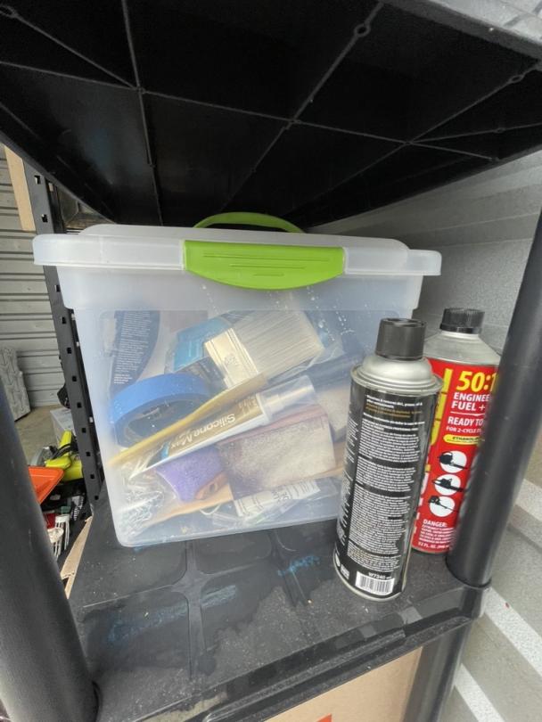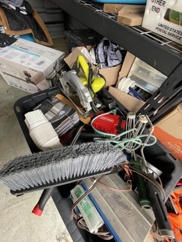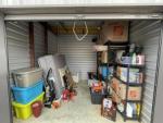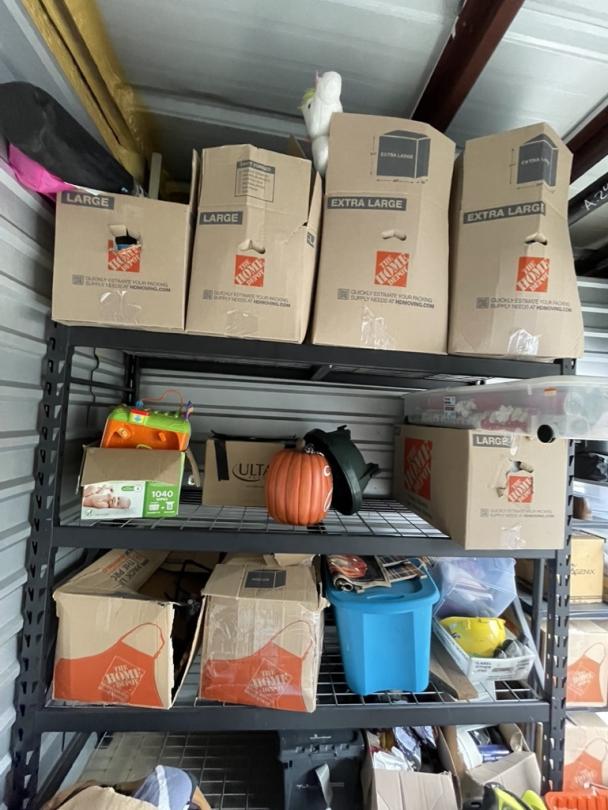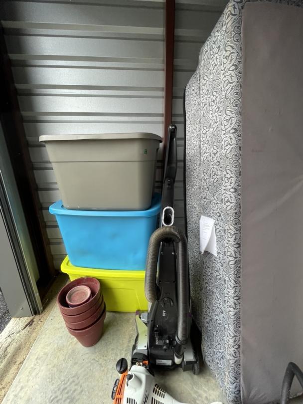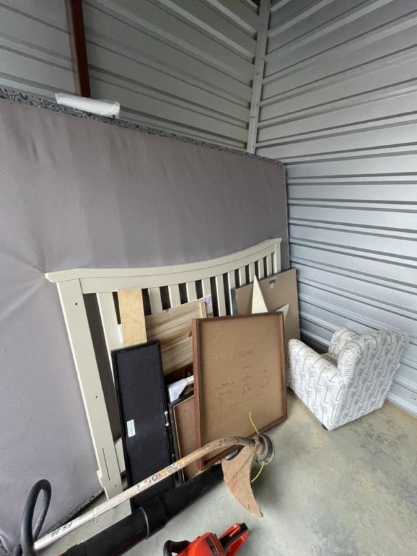 This unit appears to contain…Well organized unit with utility shelving, holiday decor, crock pot, vacuum, children's arm chair, gas leaf blower, chainsaw, weed eater, wooden headboard, queen mattress set, picture frames and toys.