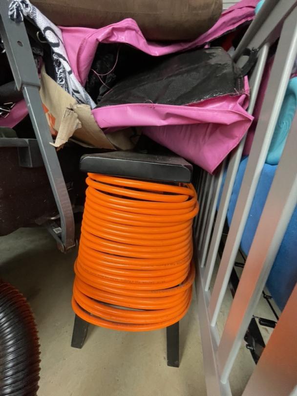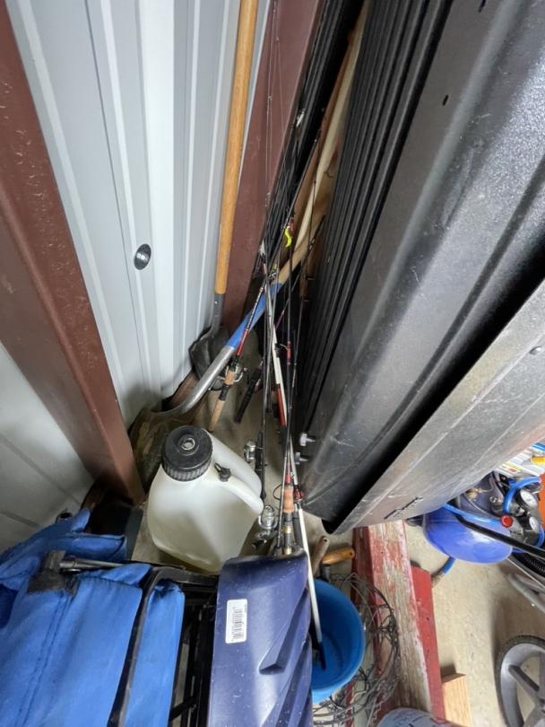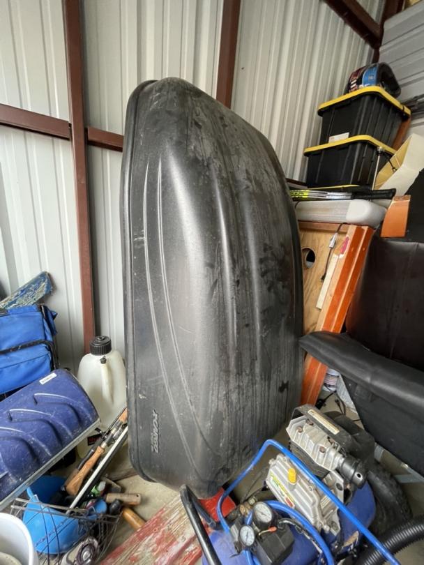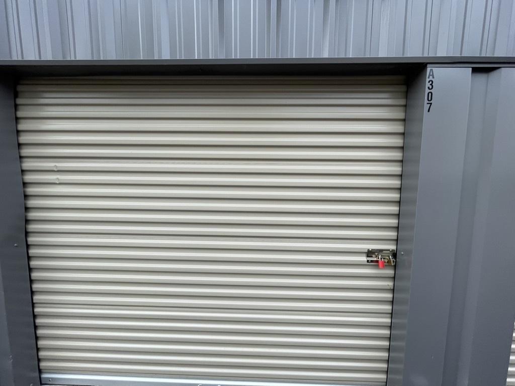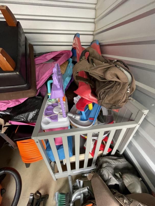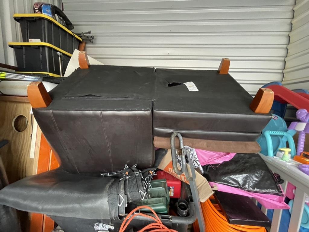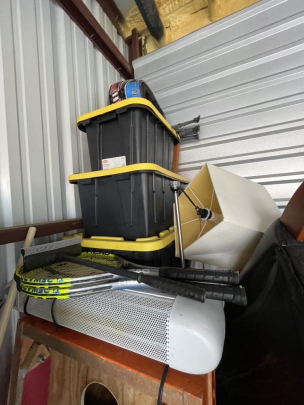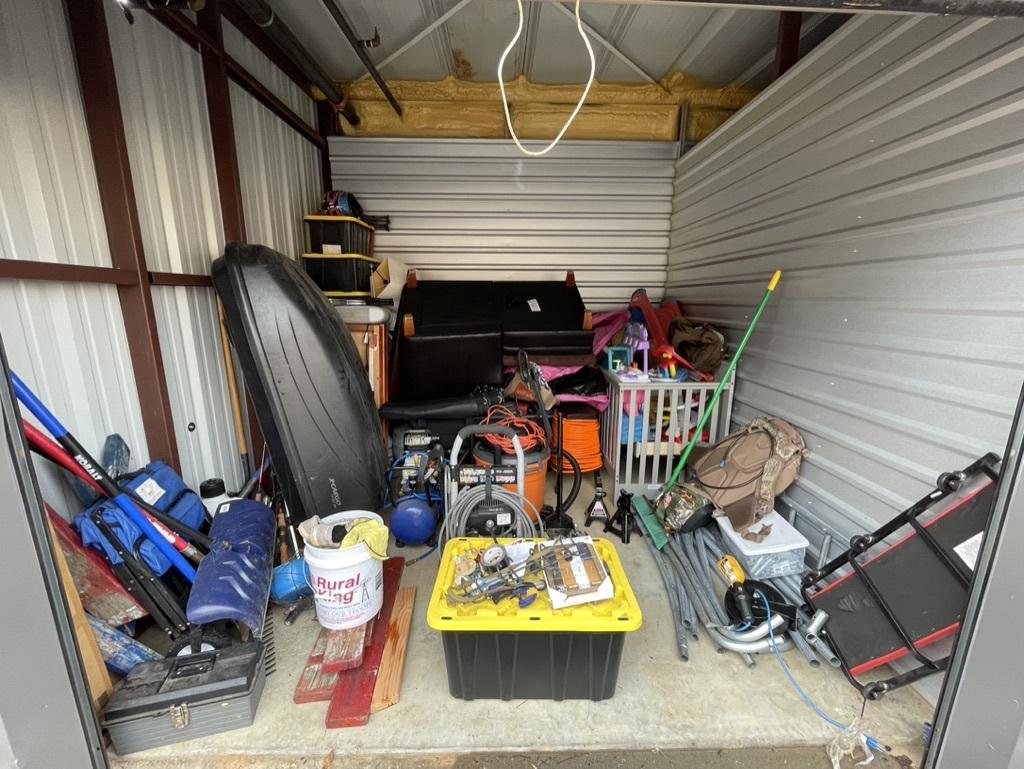 This unit appears to contain…Uncluttered unit with various items including a large, hardshell rooftop carrier for car, tools, fishing gear, loveseat, power washer and garden tools, tennis rackets, camping chairs and gear, a corn hole set, car creeper, and much more.