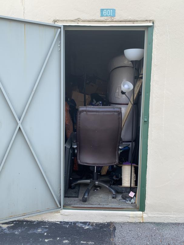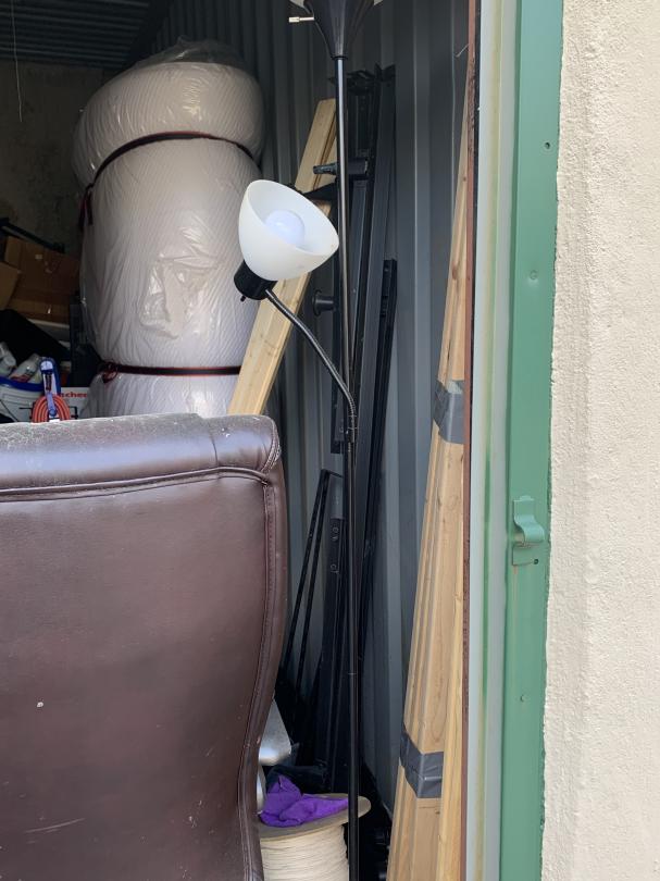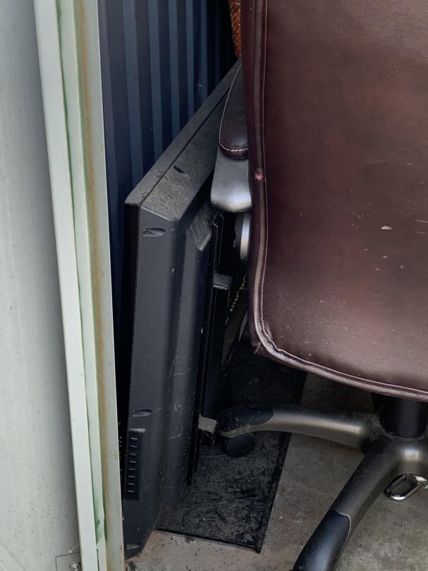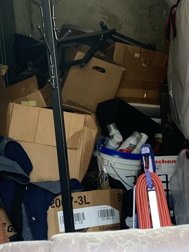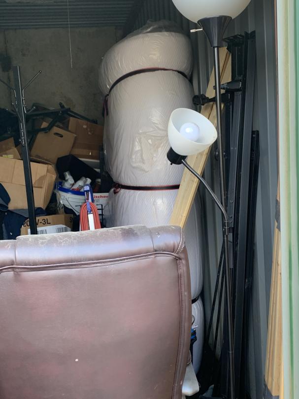 This unit appears to contain…chair, lamp, coat rack, vacuum, boxes, mattress, flat screen tv, totes