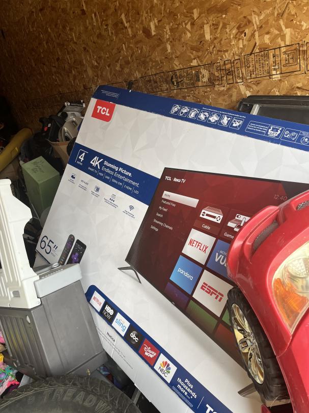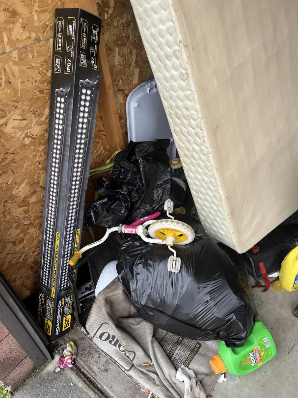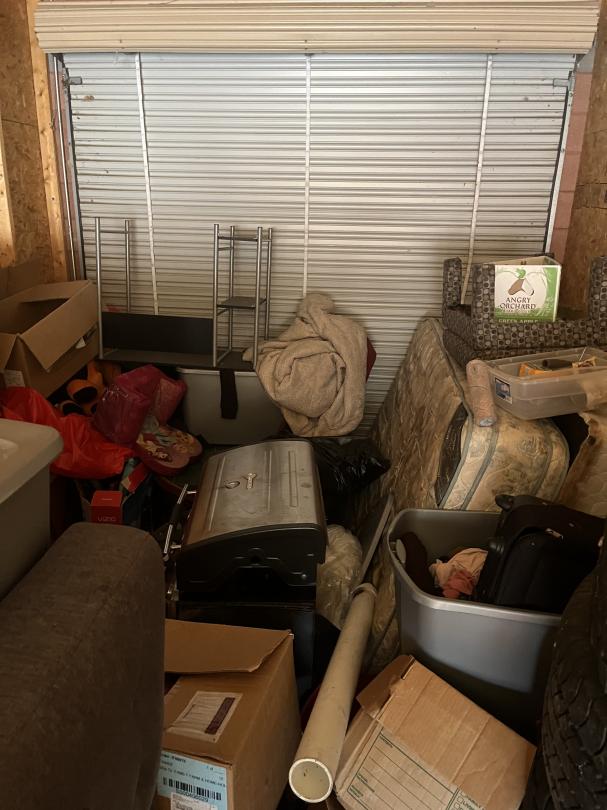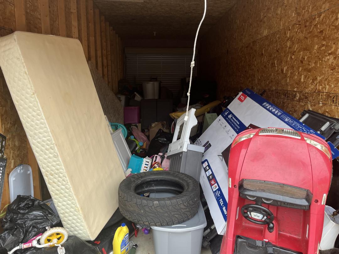 This unit appears to contain…Tires, guitar, TV, car seats, households, clothes, bike, grill,
