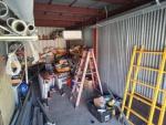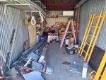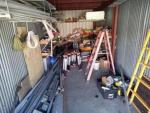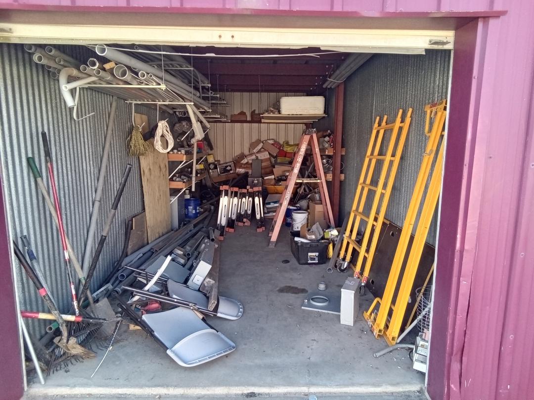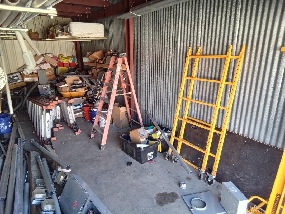 This unit appears to contain…Unit appears to have shovels, rake, ladders, scaffolding, folding chairs, metal and plastic pipes, boxes of electric equipment