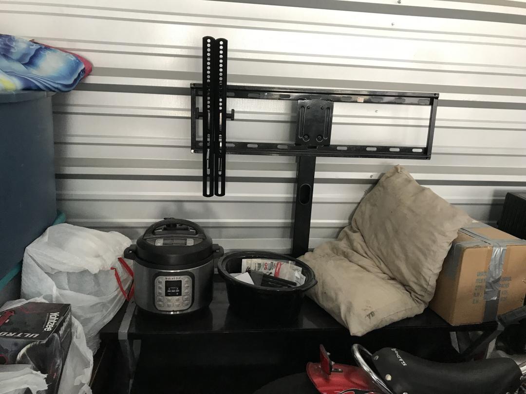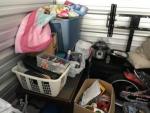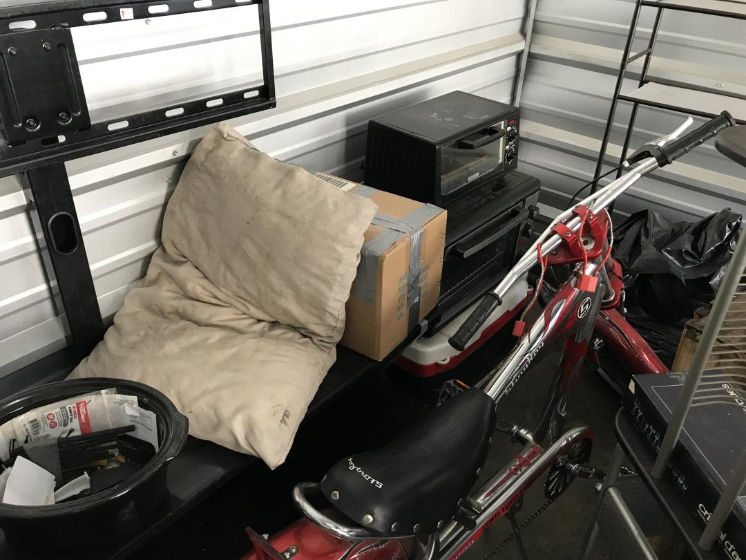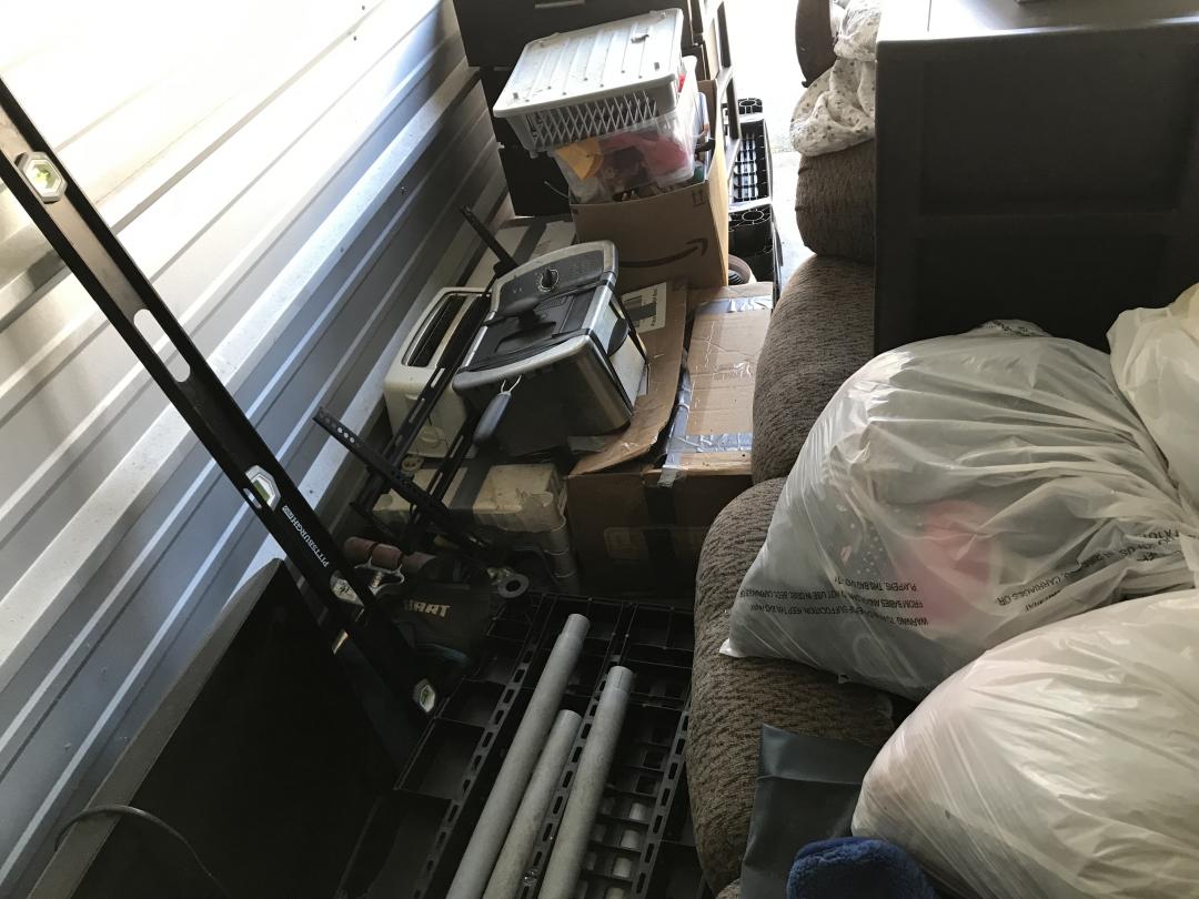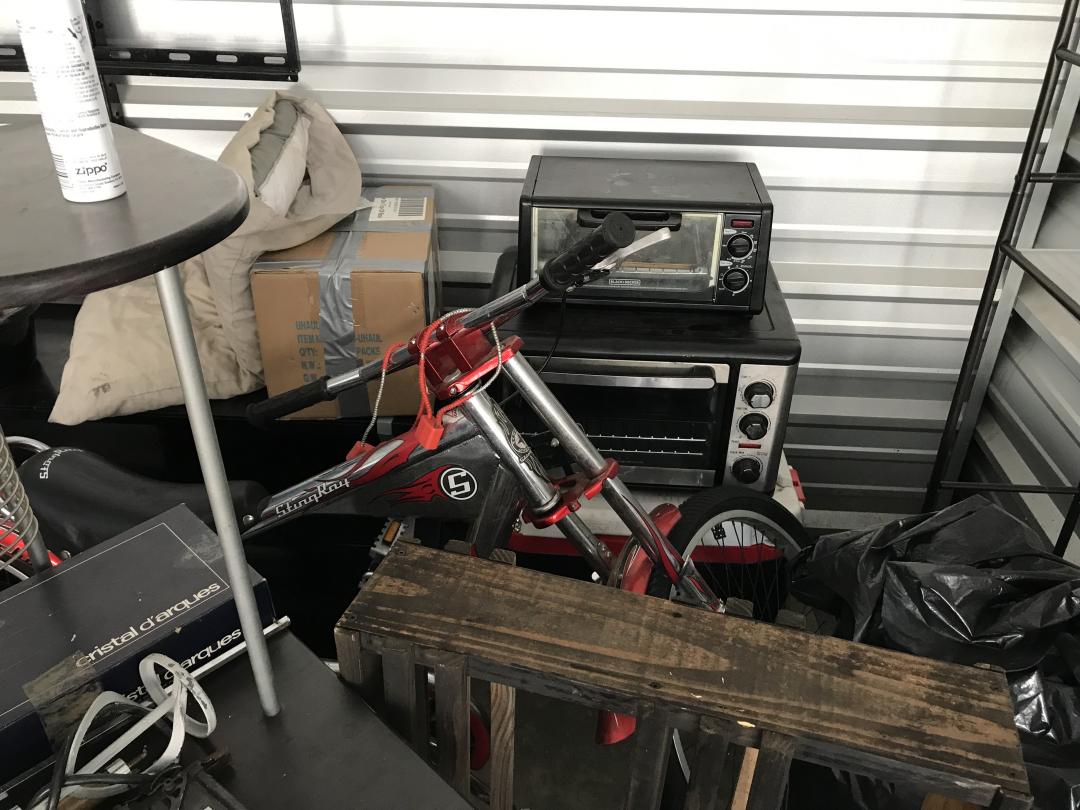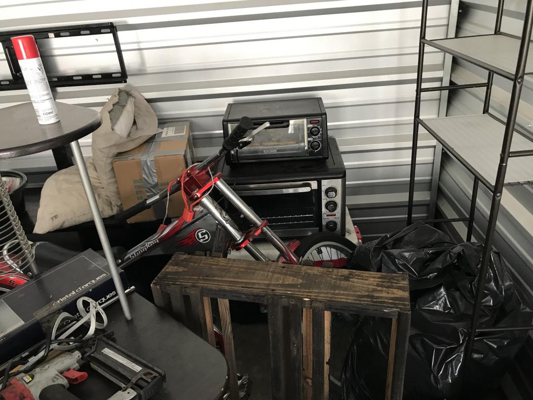 This unit appears to contain…side tables, plastic organizers, cloth couch, tools, 3-mini refrigerators, 4-mini-bikes, computer, monitor, desk, laundry baskets, toys, Instapot, TV monitor stand, StingRay motorcycle, toaster ovens, tool box, army bag, lamps,