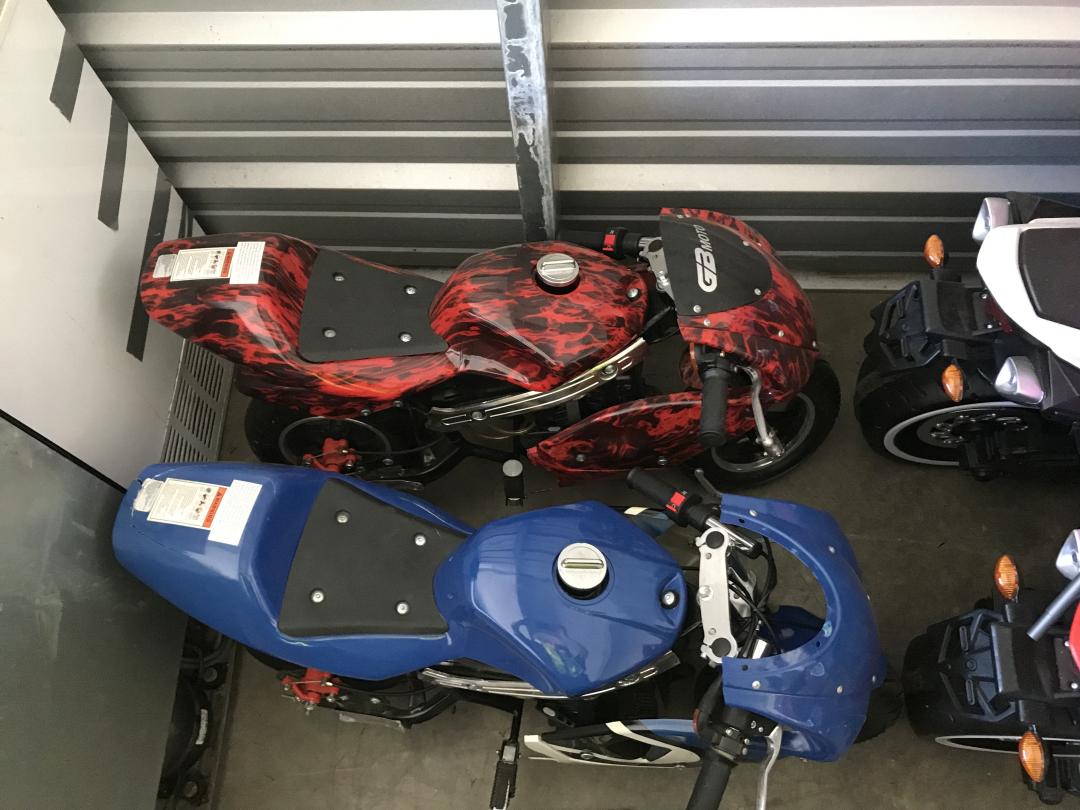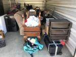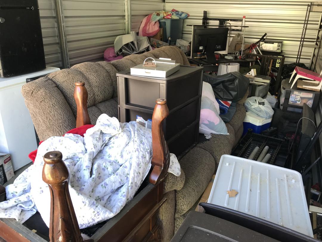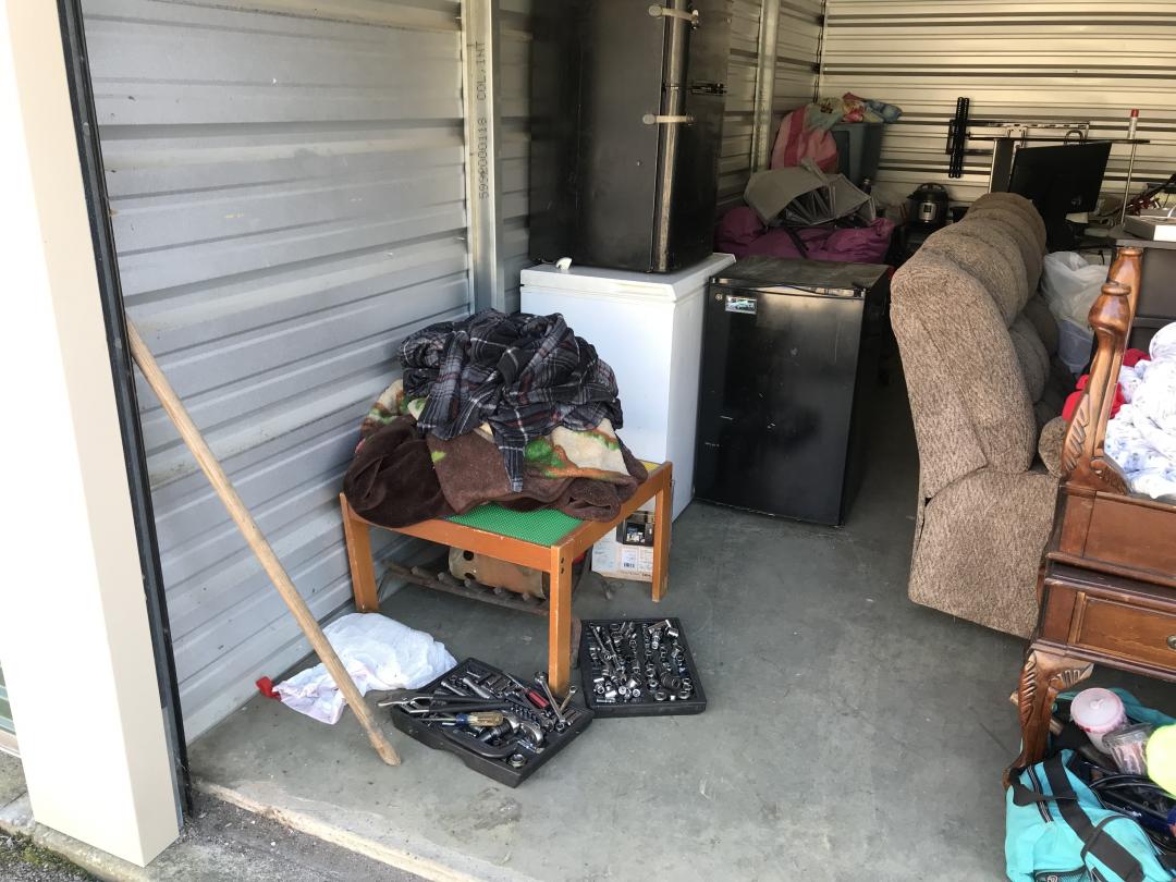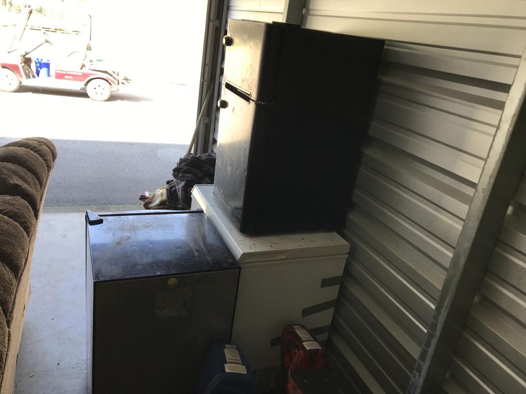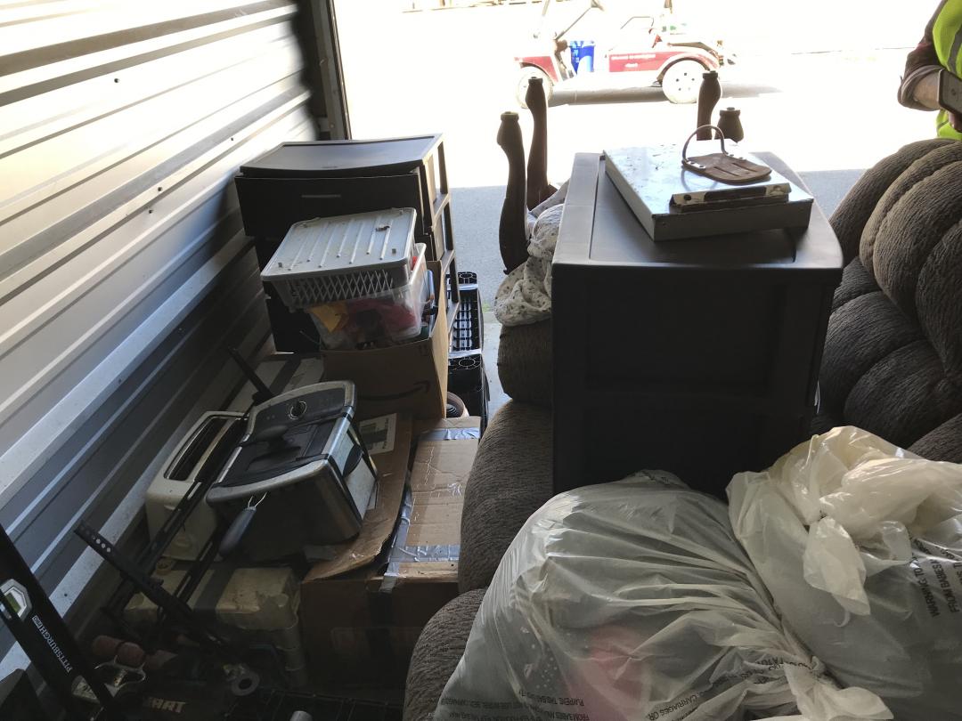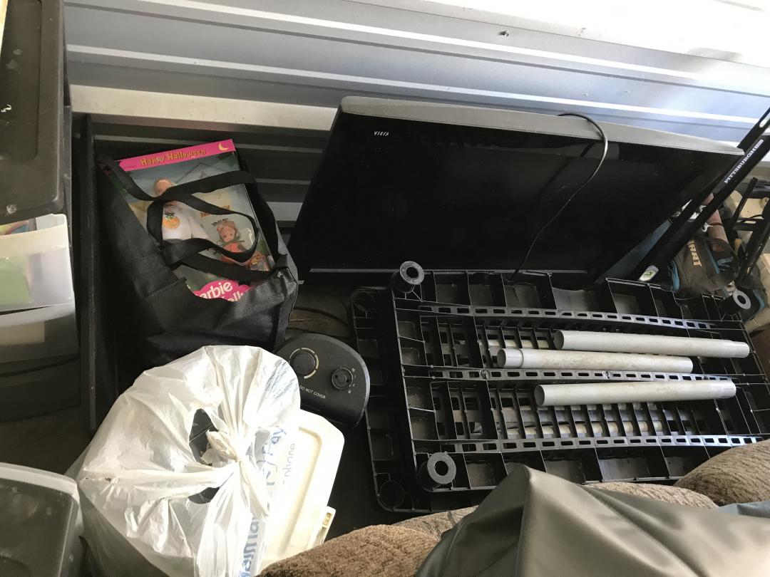 This unit appears to contain…side tables, plastic organizers, cloth couch, tools, 3-mini refrigerators, 4-mini-bikes, computer, monitor, desk, laundry baskets, toys, Instapot, TV monitor stand, StingRay motorcycle, toaster ovens, tool box, army bag, lamps,