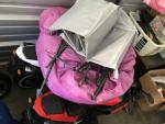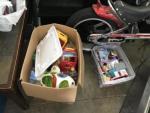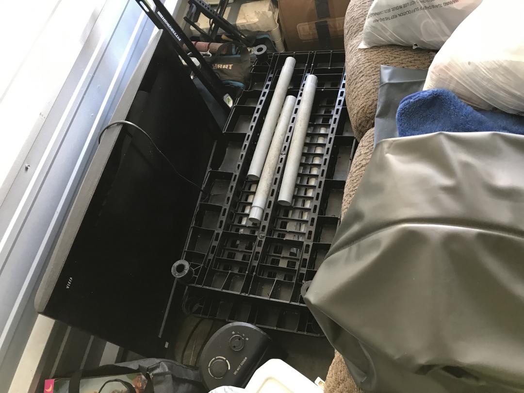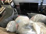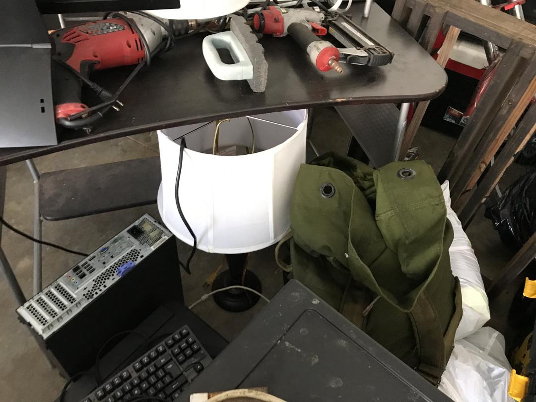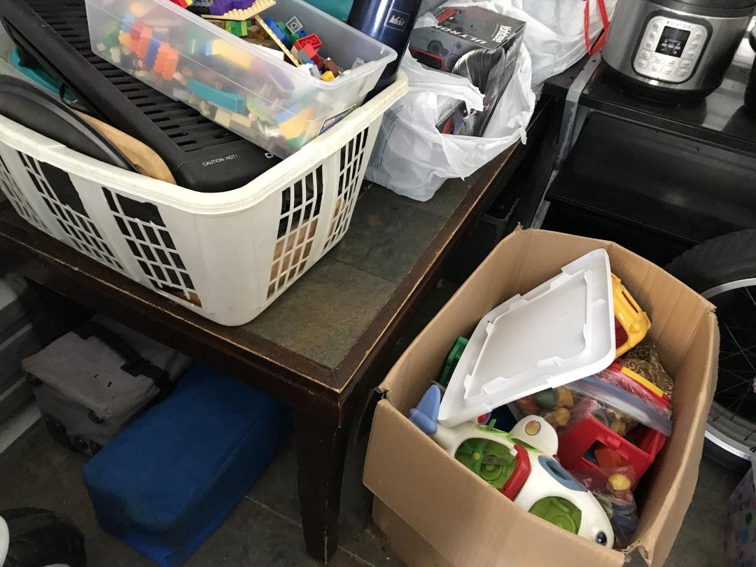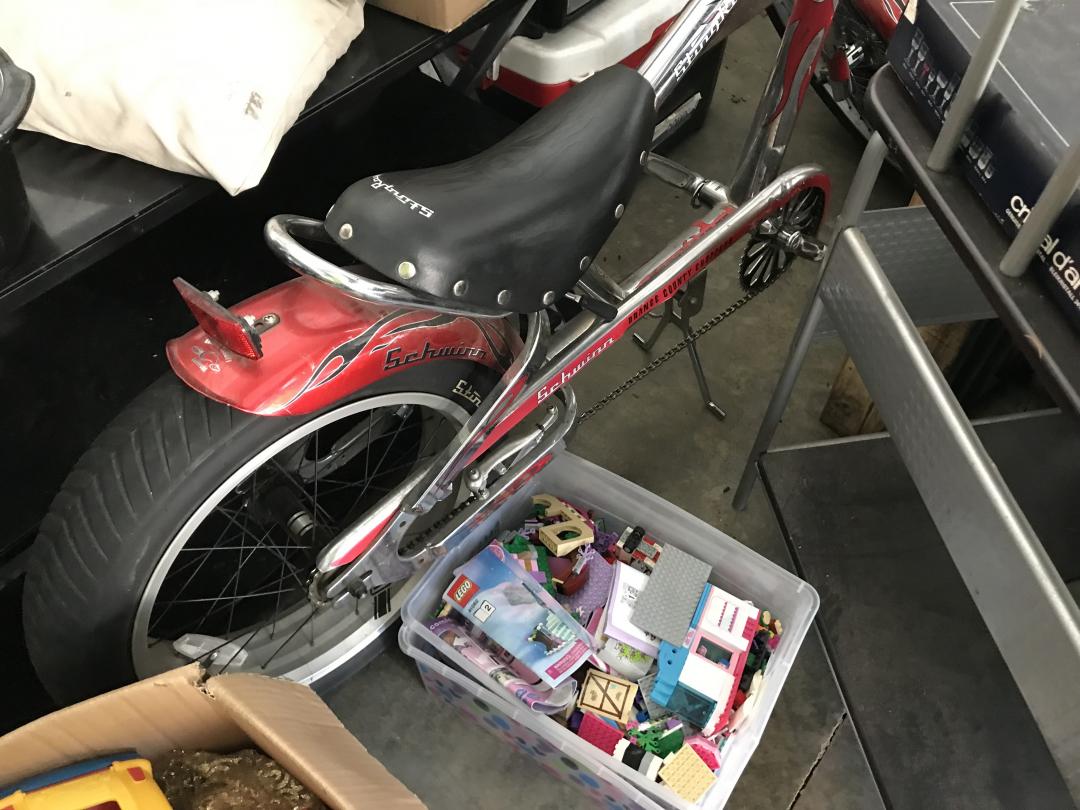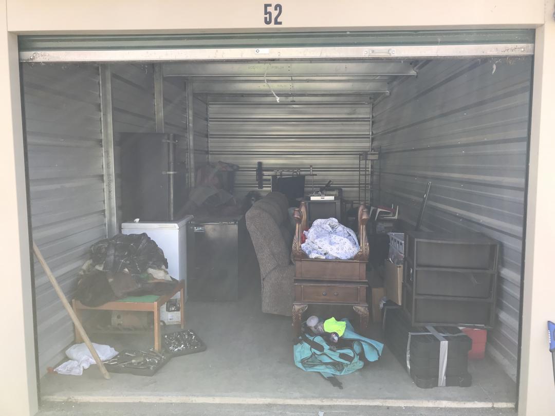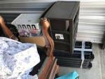 This unit appears to contain…side tables, plastic organizers, cloth couch, tools, 3-mini refrigerators, 4-mini-bikes, computer, monitor, desk, laundry baskets, toys, Instapot, TV monitor stand, StingRay motorcycle, toaster ovens, tool box, army bag, lamps,