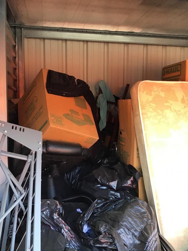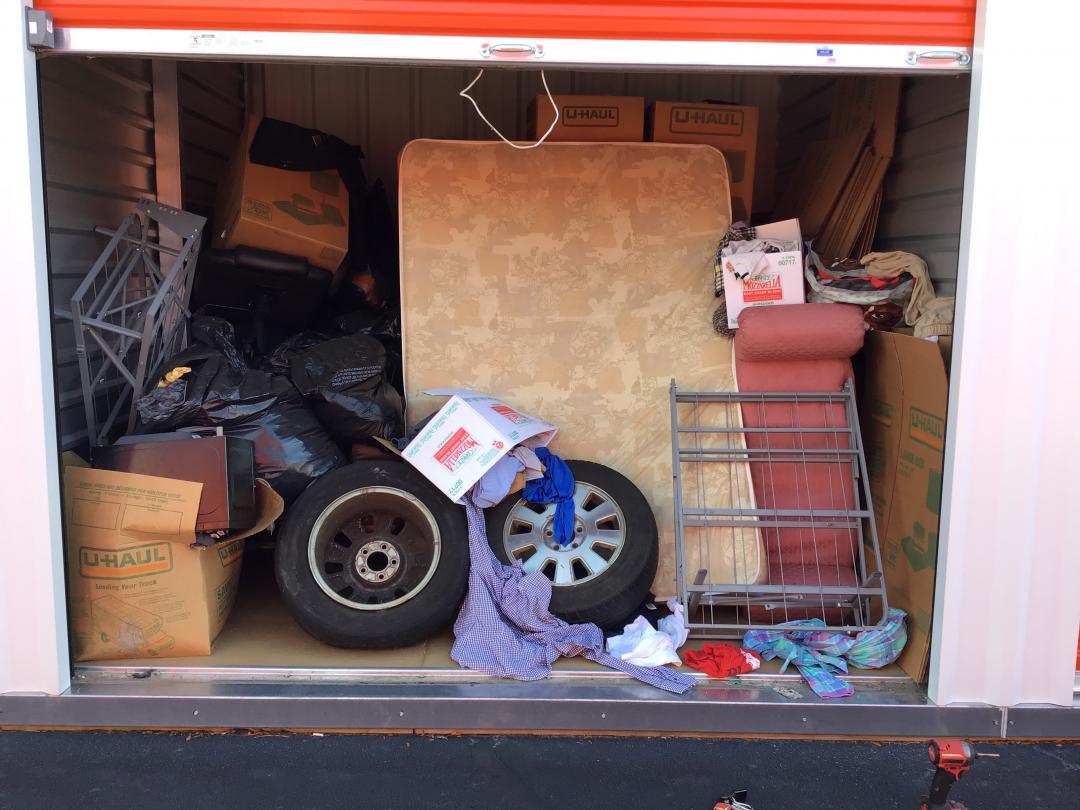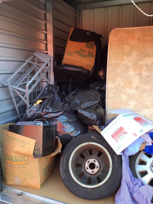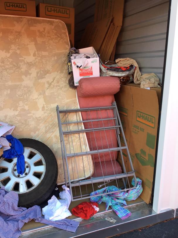 This unit appears to contain…10x10x9 Outdoor drive up unit that appears to have a mattress, accent bench, clothes, tires, microwave, computer chair and other miscellaneous items
