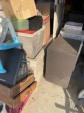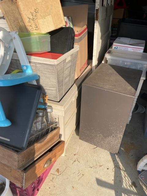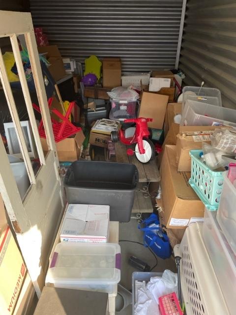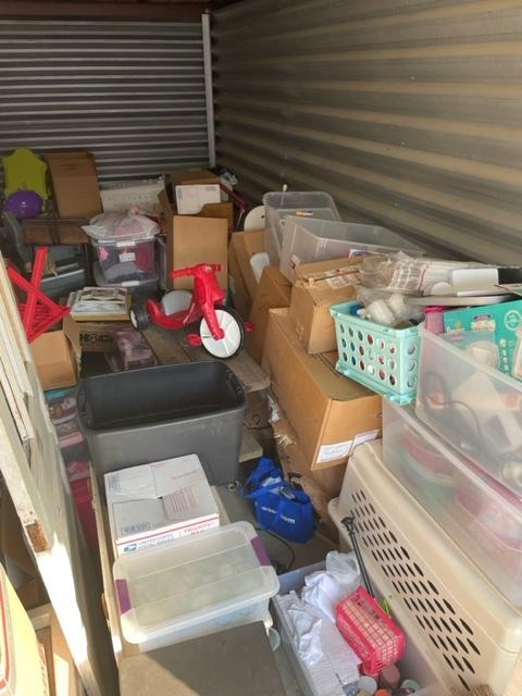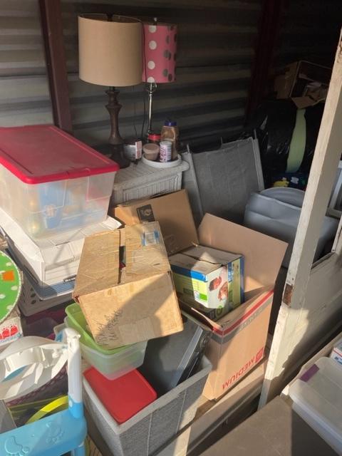 This unit appears to contain…Drive-Up Storage unit appears to contain mirror wood door white table totes large dog carrier 2 lamps miscellaneous boxes kids toys wicker chest bird house trunk chest