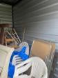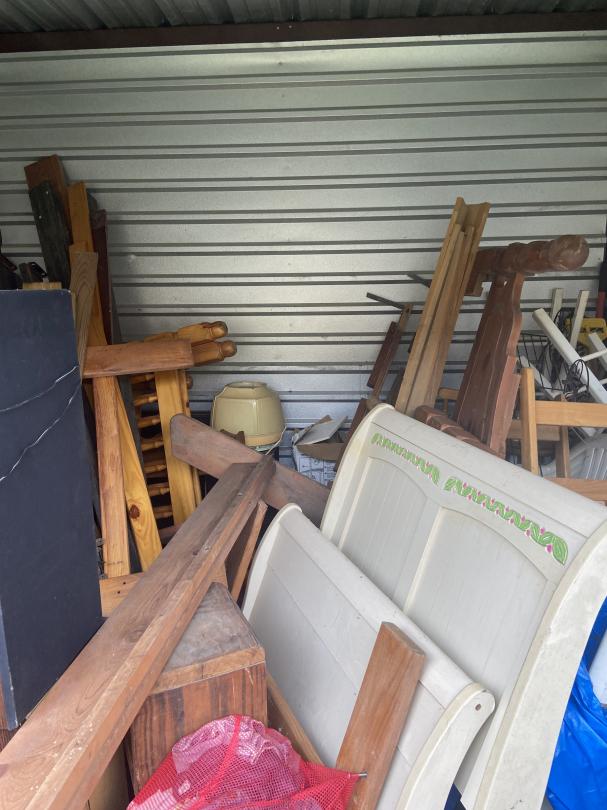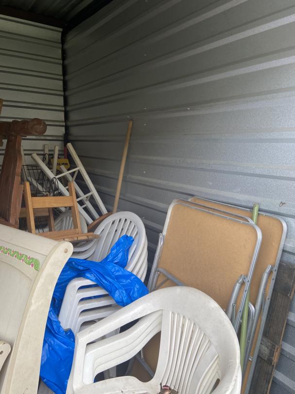 This unit appears to contain…Household items, old speakers, wooden furniture, chairs, wooden stools, outdoor tables, plastic chairs, clothes.