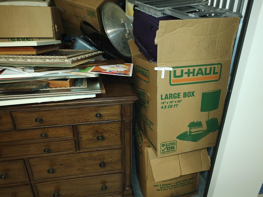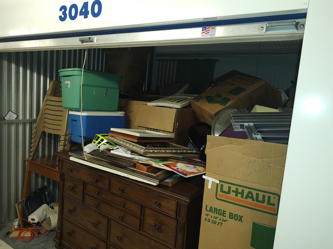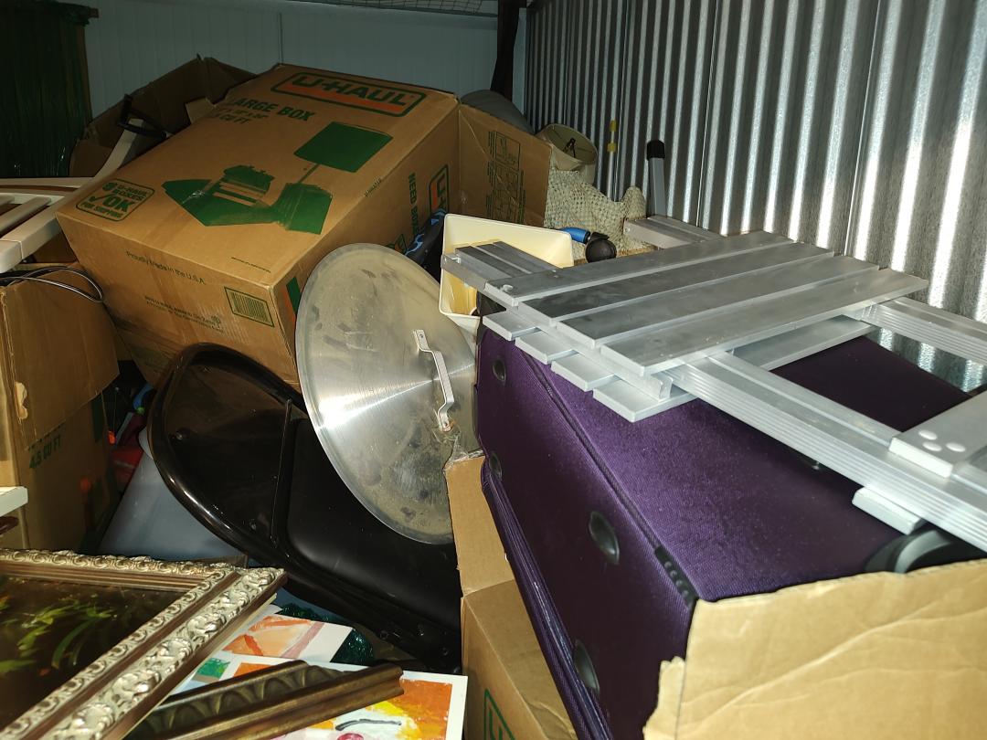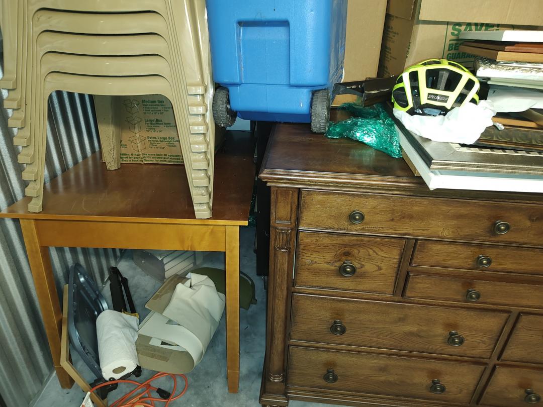 This unit appears to contain…Furniture, boxes, plastic totes, chairs, misc. household goods