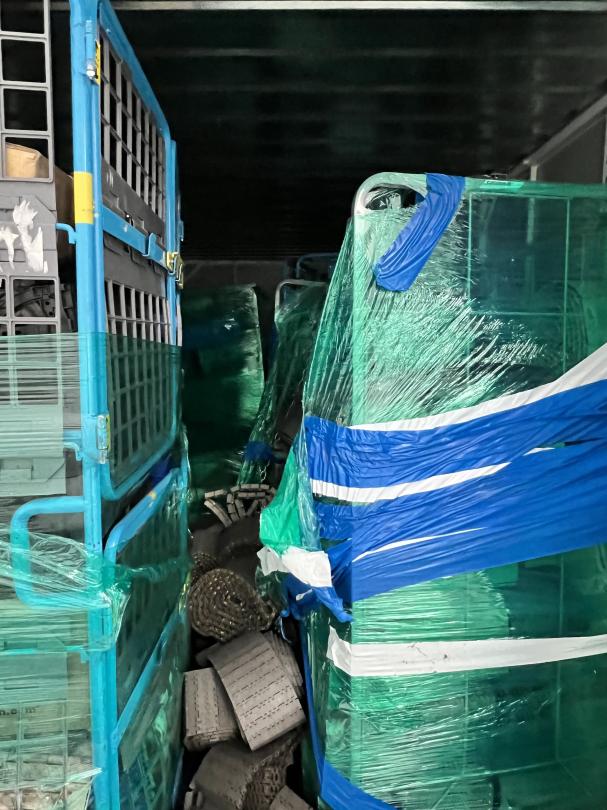 This unit appears to contain…Commercial machinery material, possibly conveyor belt type of raw material, etc, and storage racks. Don't miss out on the great find! Container is fully packed!