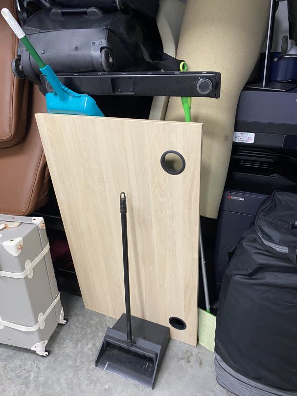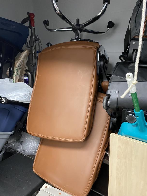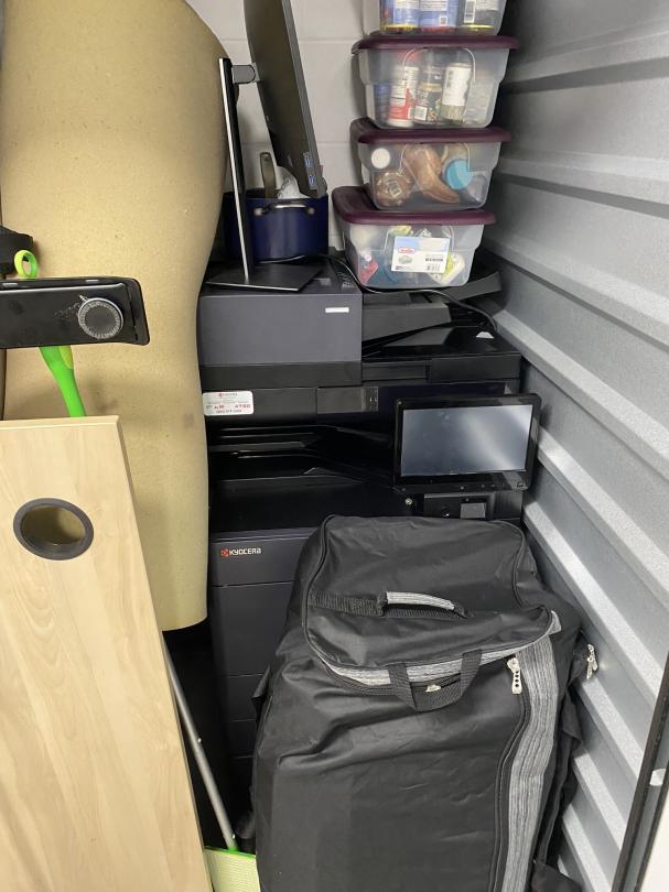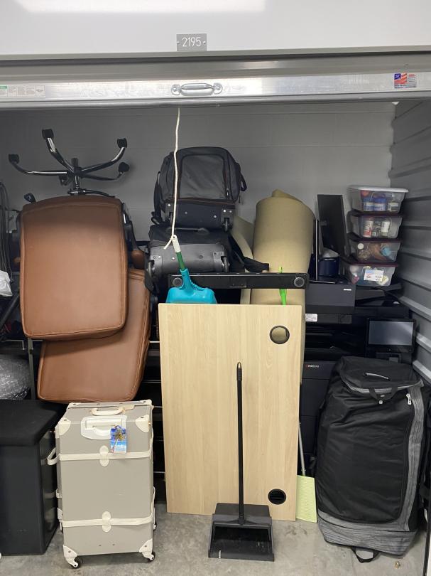 This unit appears to contain…chairs, office chairs, desk, suitcase, duffle bag, vacum, totes, printer, moniter