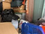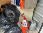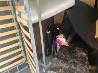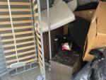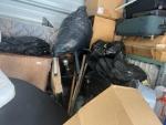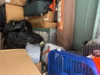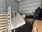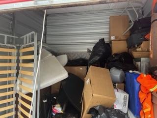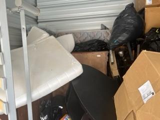 This unit appears to contain…Washer, Fan, Futon, Bags, Mattress, Dresser, Wheel Chair, suitcases, Totes, DVD's, Yard Tools, Boxes, TV Stand