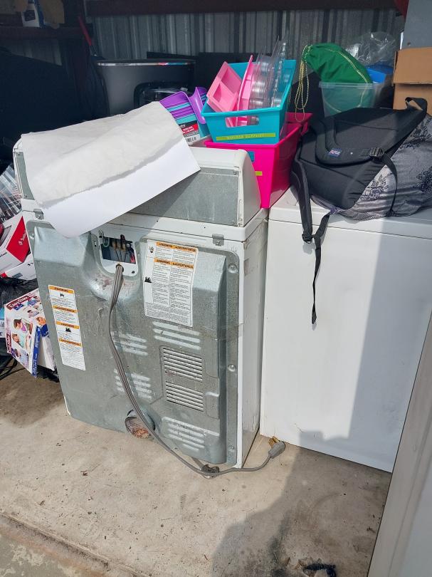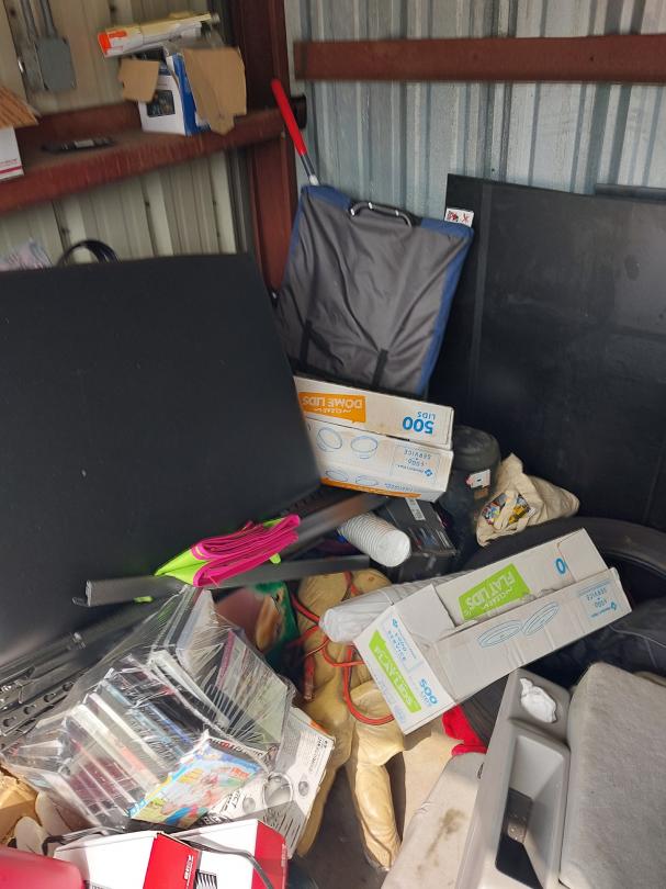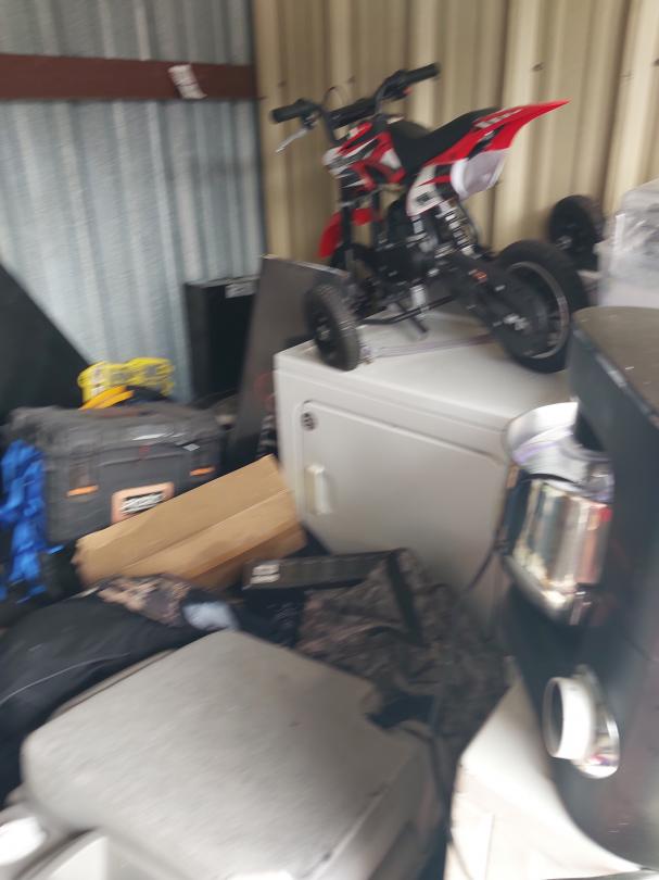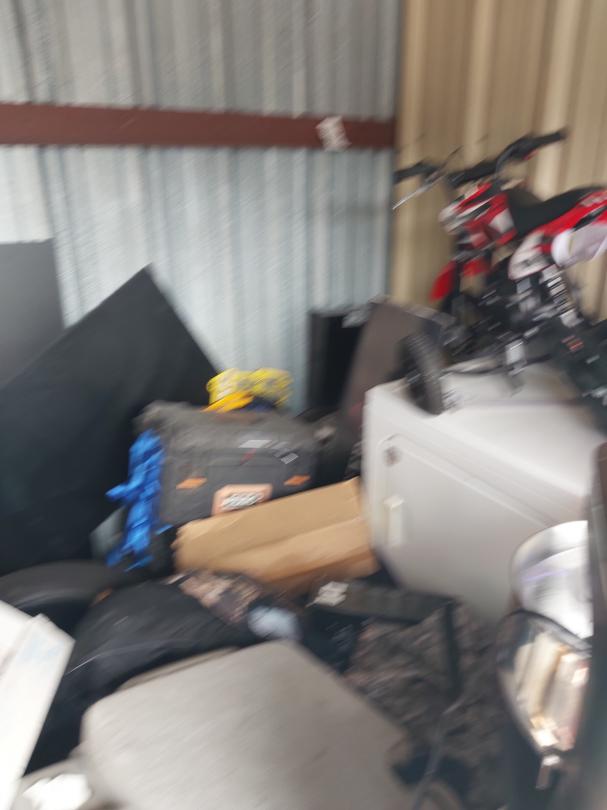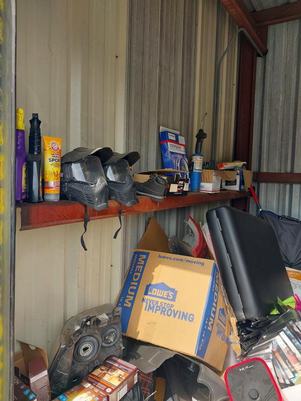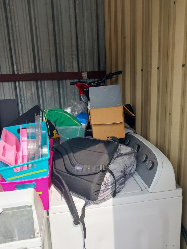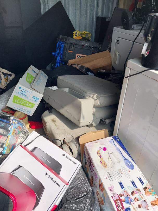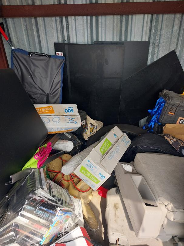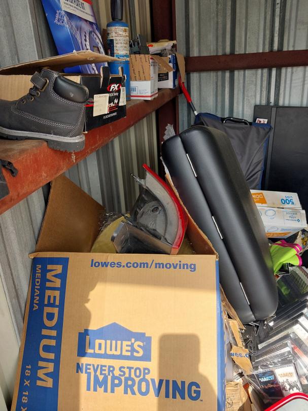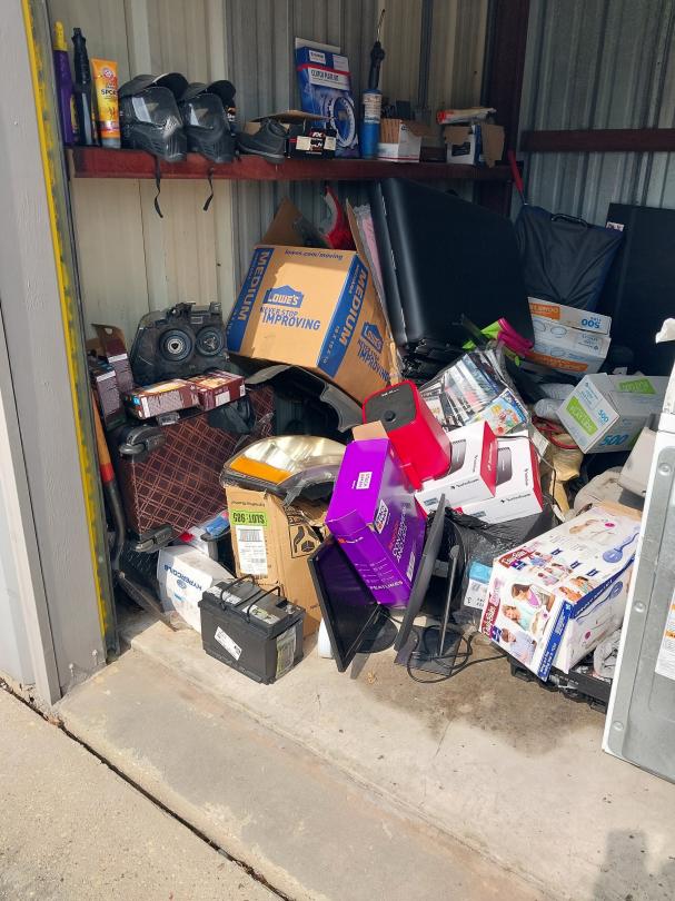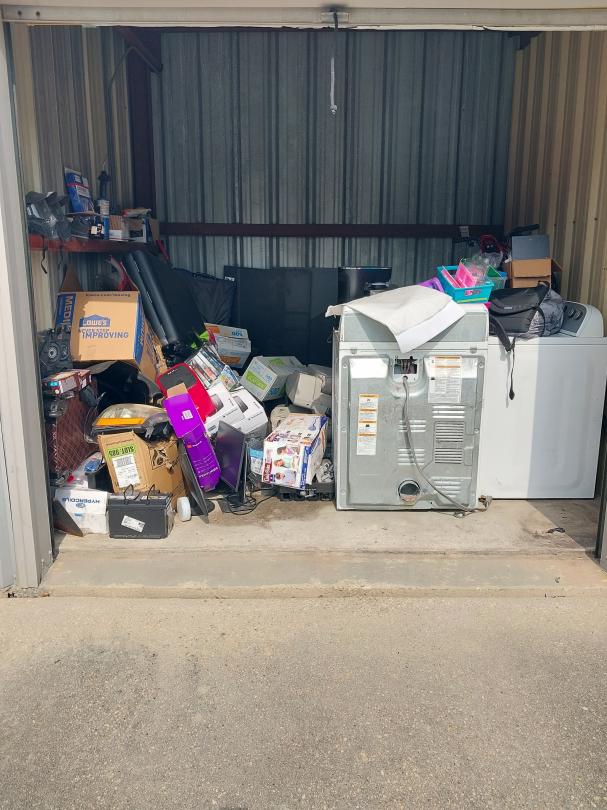 This unit appears to contain…10X10X8 Boxes, Washer, Dryer, Computer Monitor, Car Seat, Kids Bike, Helmet, Luggage, Car Parts, Tire, Shelves, Tool Box, Batteries