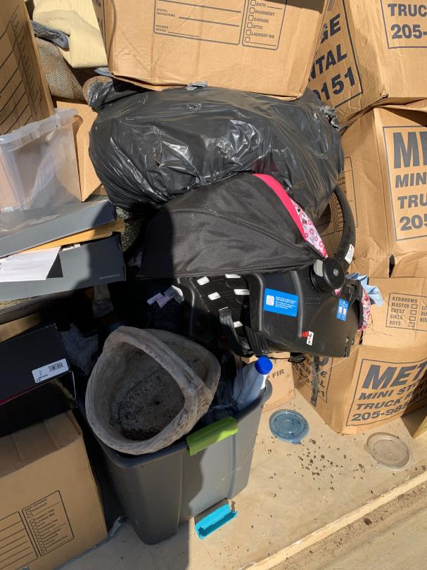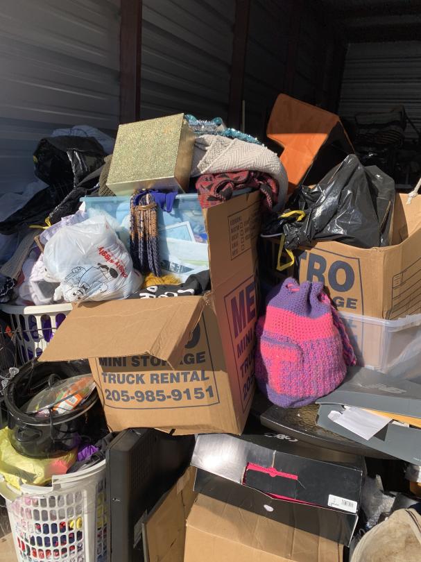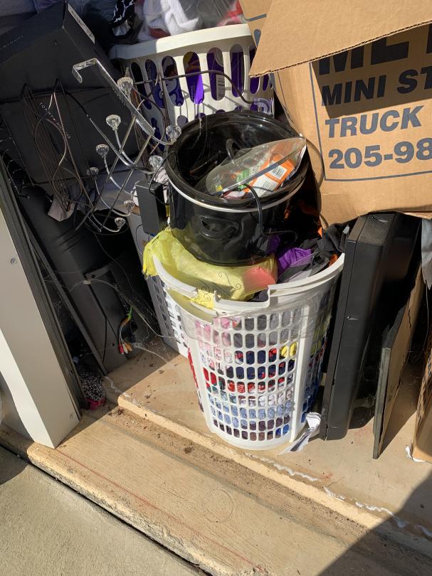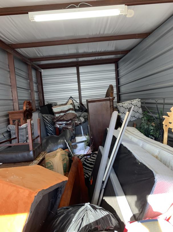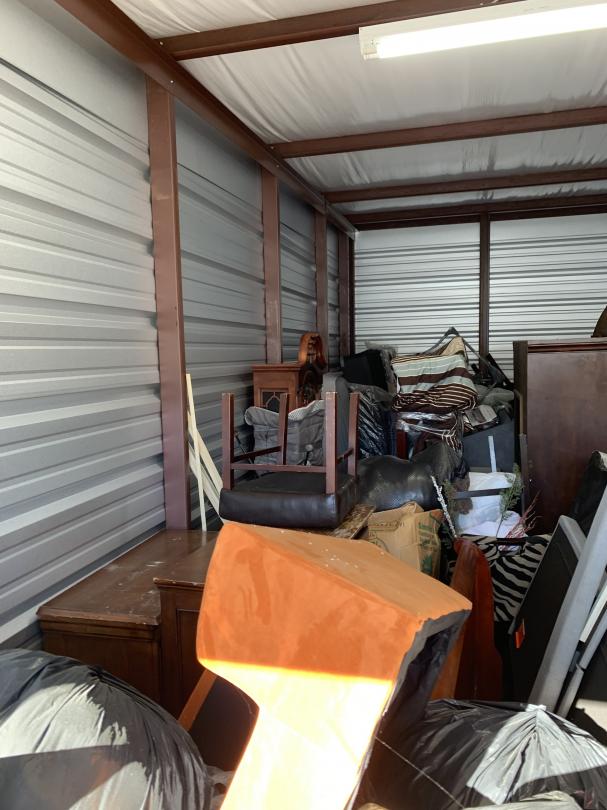 This unit appears to contain…Flat Screen TVs, Boxes, Totes, Clothes, Small Appliances, Baby Car Seat, Bed Frame, Mattress, Box Springs, China Cabinet, Chairs, Furniture