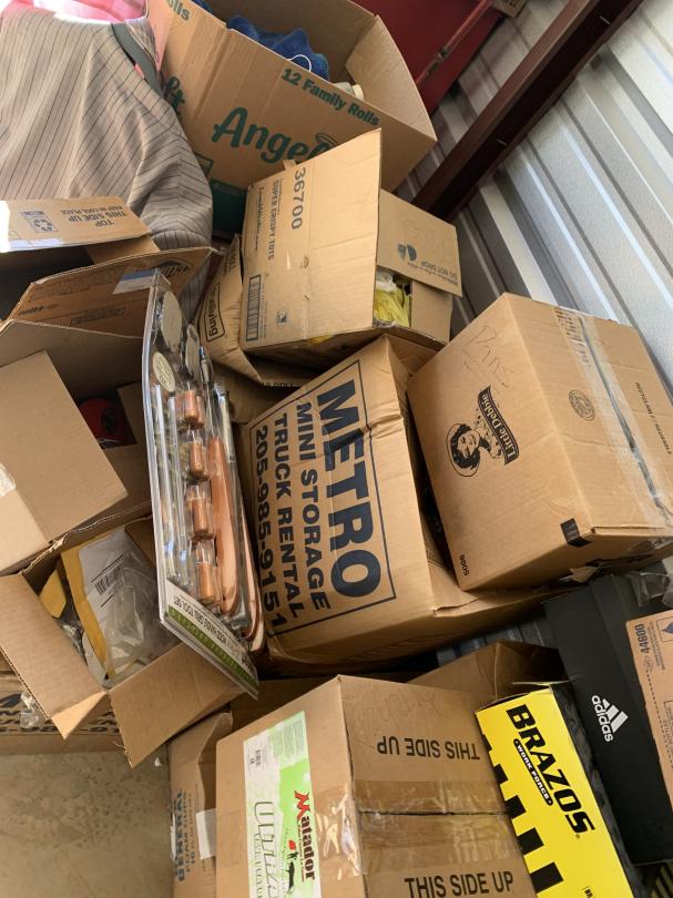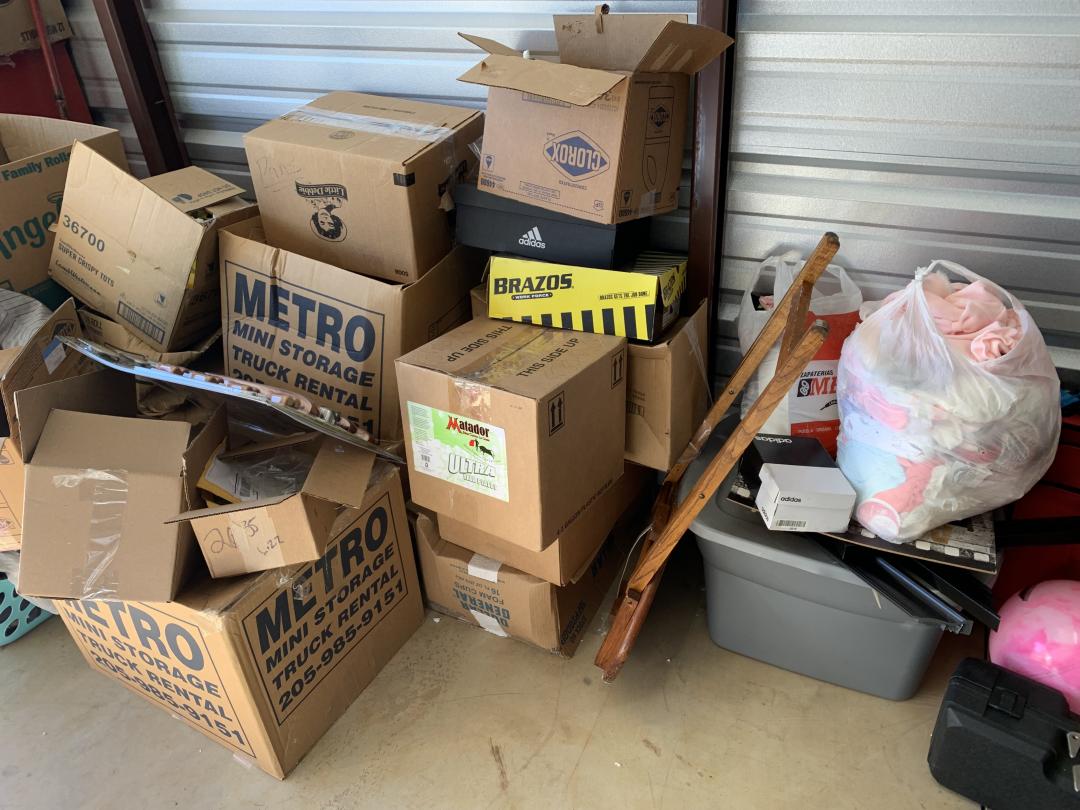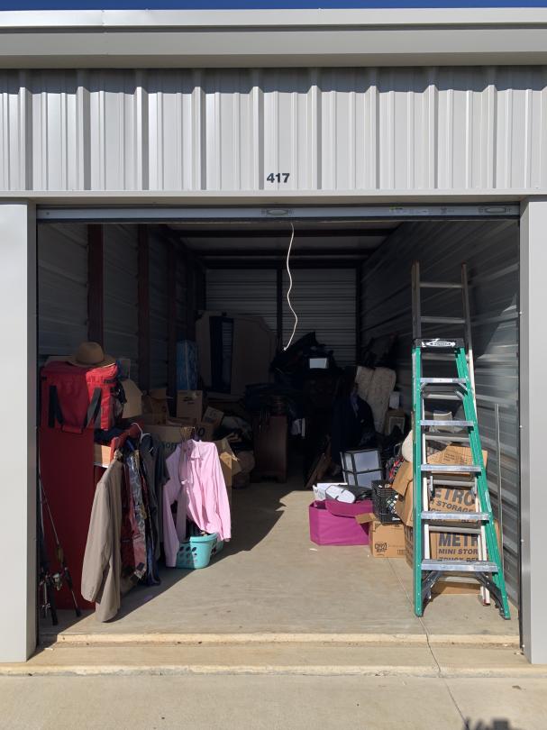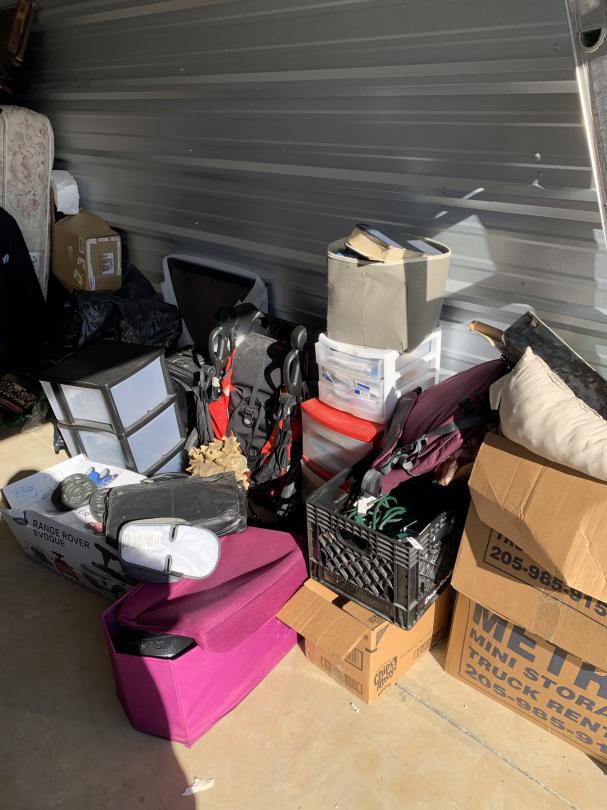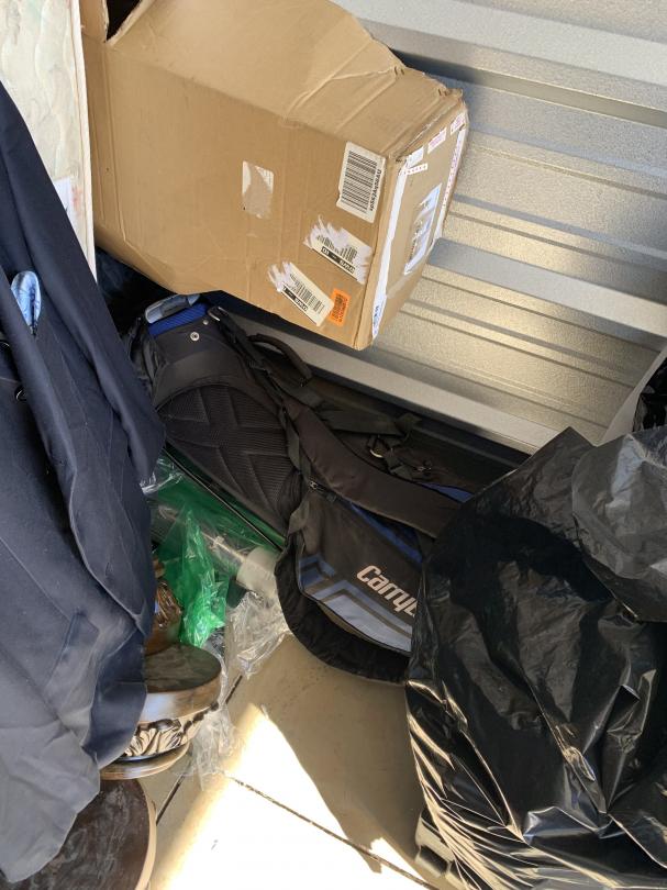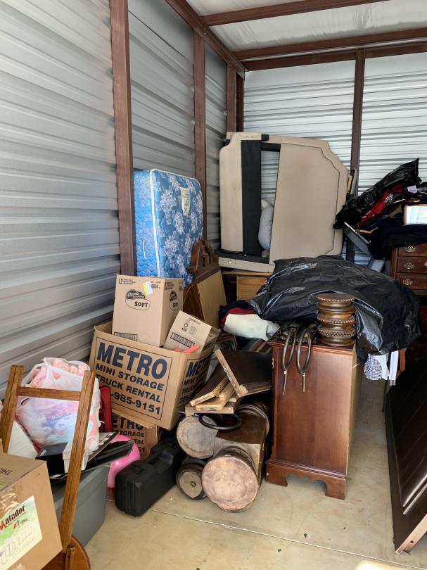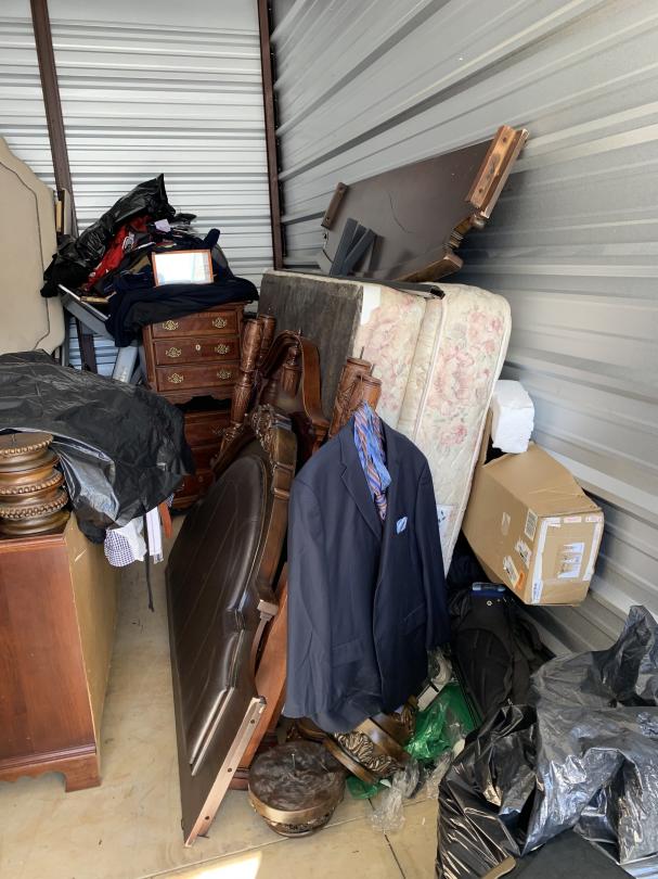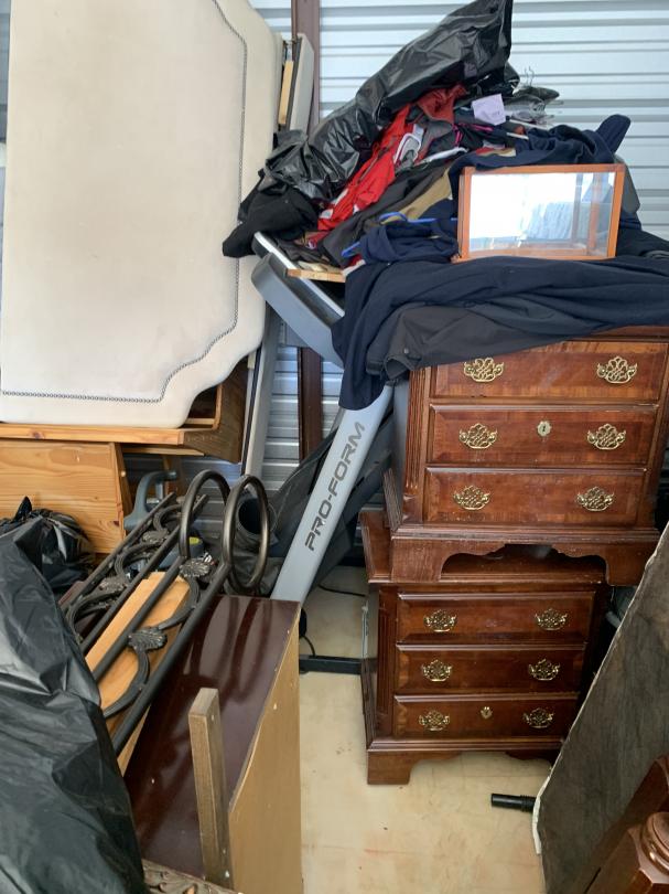 This unit appears to contain…Ladder, Fishing Poles, Clothes, Boxes, Suitcases, Organizers, Dressers, Bed Frame, Box Spring, Golf Clubs, Treadmill, Power Tools