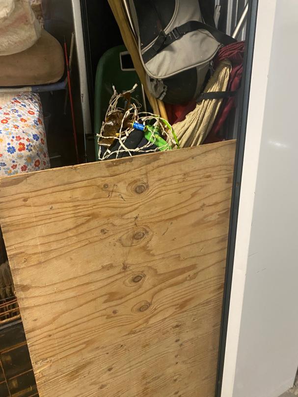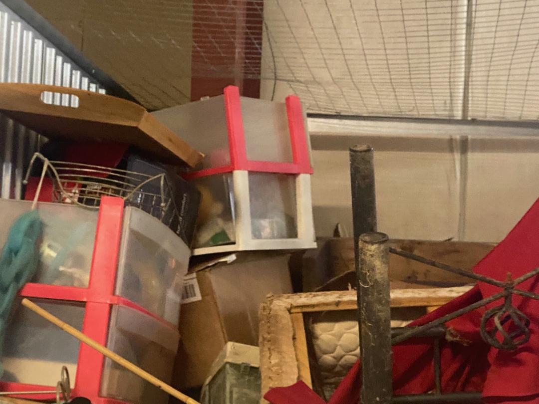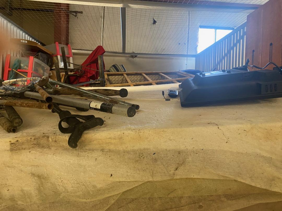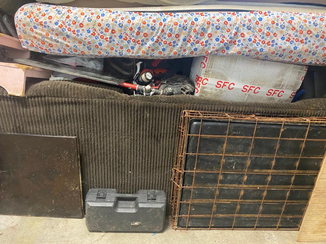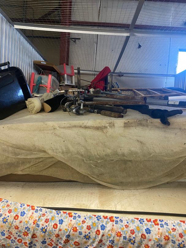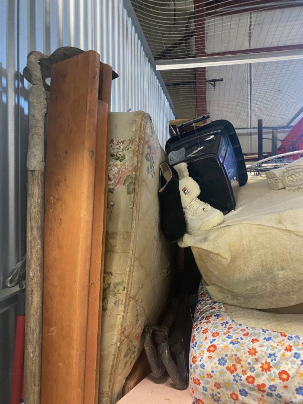 This unit appears to contain…This unit appears to contain couch, mattress, box springs, bed frame, dresser, refrigerator, TV, remote, fishing gear, trash can, duffel bag, plywood, totes, dog pen, tool box, boxes, bucket and other miscellaneous items.