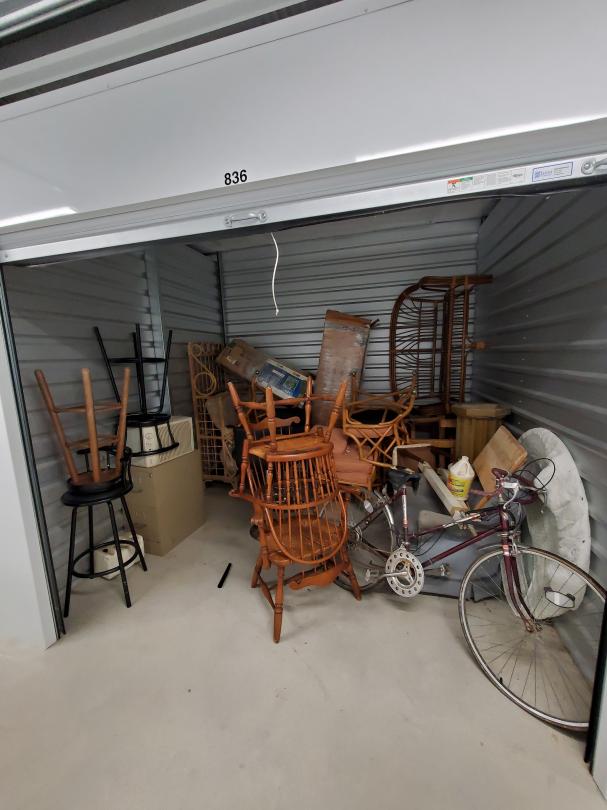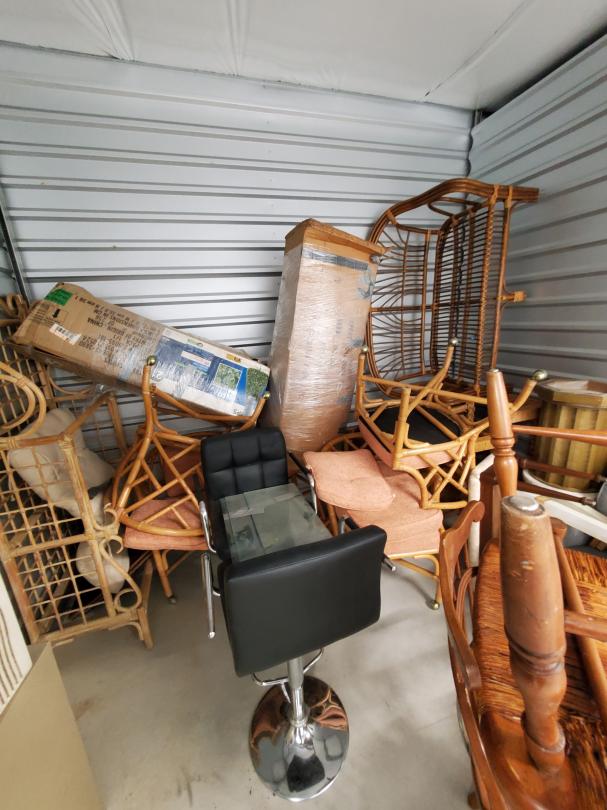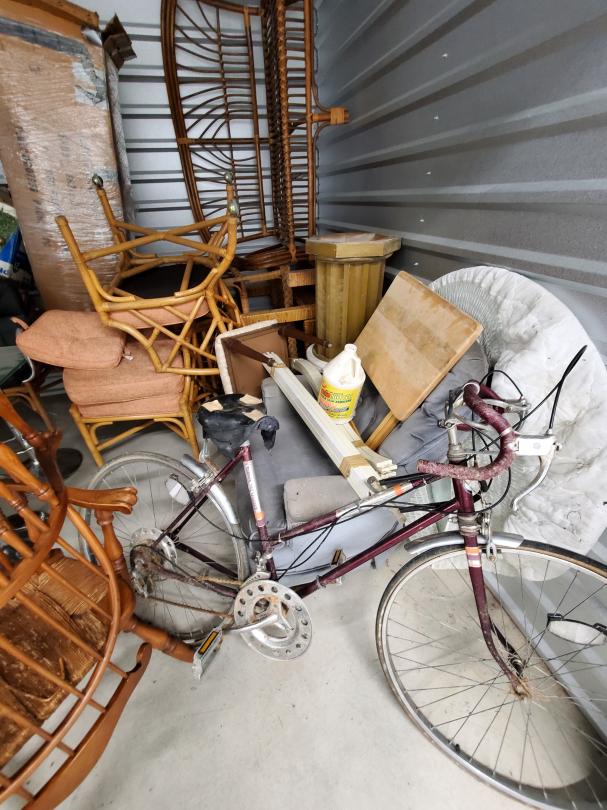 This unit appears to contain…Unit appears to contain, wicker furniture, christmas tree, black stools, hammock, adult bike. fabric chair, filling cabinet