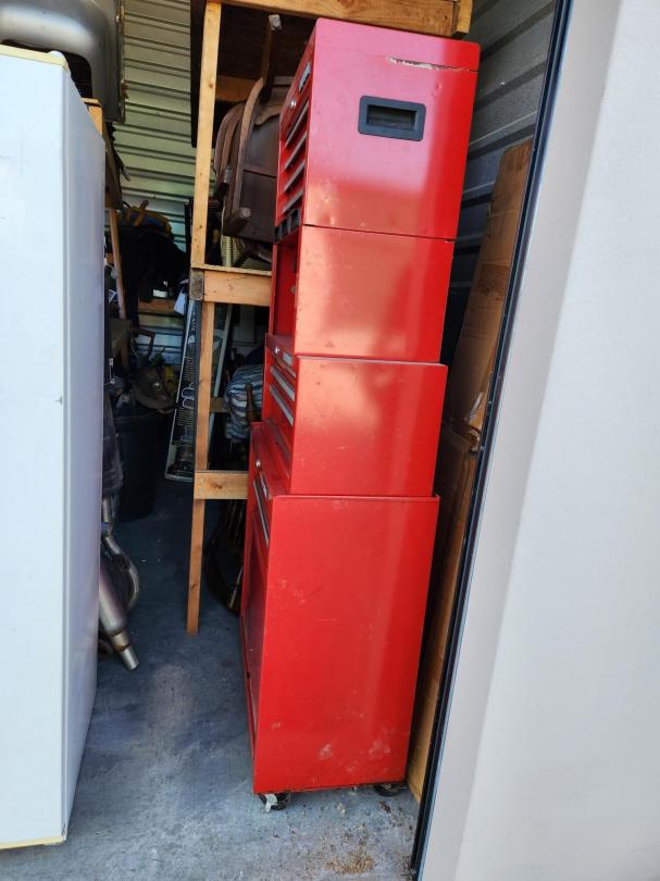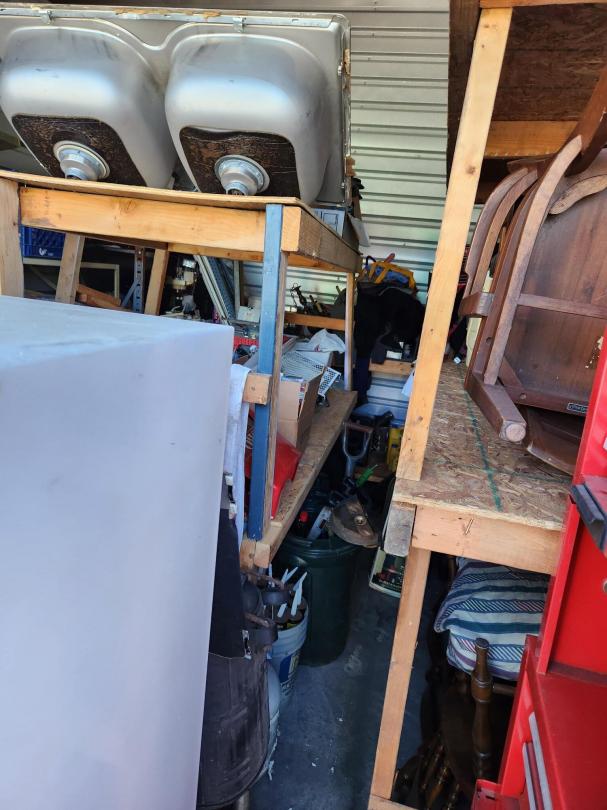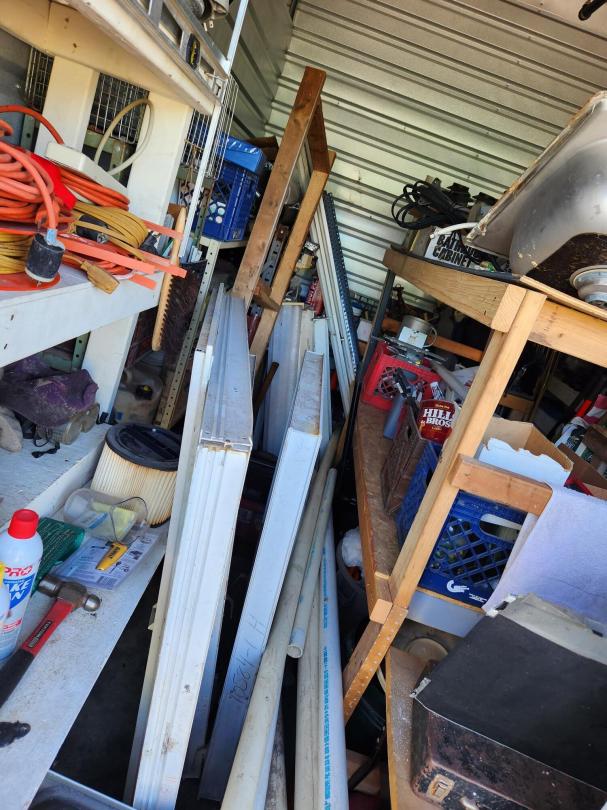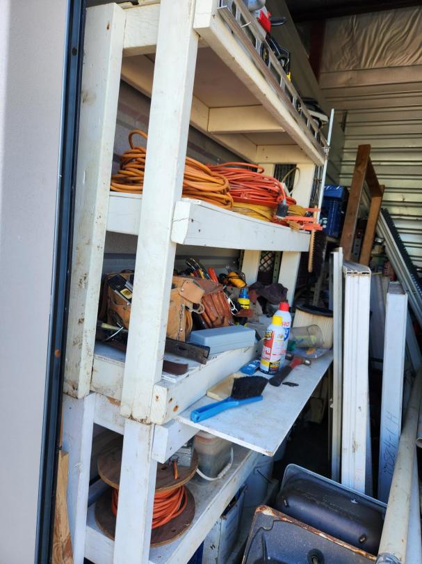 This unit appears to contain…Unit appears to contain, Refrigerator, sinks, upright toolbox, extension cords, windows, shelving units and misc tools.